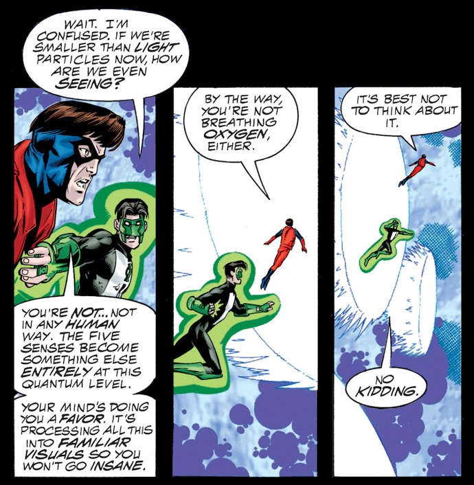 Atomo, comparso nel 1961, un anno prima di Ant-Man, è in grado di ridurre le sue dimensioni fino al mondo microscopico e, come mostrato nella doppia storia di Waid, fino alle dimensioni di un fotone. Dimenticandosi per un attimo il fatto che non avrebbe molto senso parlare di dimensioni di un fotone, è interessante come in un paio di vignette, durante un dialogo con Lanterna Verde, all’epoca Kyle Rayner, Waid mette in bocca un paio degli inconvenienti legati alla miniaturizzazione: