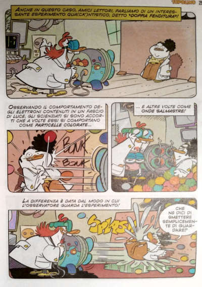 La rivoluzione della meccanica quantistica inizia tra il 1899 e il 1900 con la scoperta/introduzione di una nuova costante da parte del fisico teorico tedesco Max Planck, il cui nome viene parzialmente utilizzato per quello di Dinamite Blanck, avo del più noto Bla nonché inventore della meccanica qua(ck)ntistica. Questo mondo risulta ricco di possibilità, come scrive lo stesso Vitaliano nell’ultima didascalia della quarta pagina della storia: