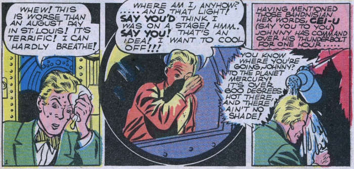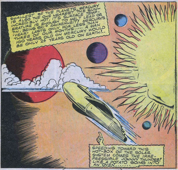 Anche nei fumetti Mercurio, come pianeta, è stato poco protagonista. La storia più notevole è quella pubblicata su All-Star Comics #13 dell’ottobre 1942. Scritta da Gardner Fox, Shanghaied into Space vede la Justice Society dirigersi in missione sui pianeti del sistema solare, ognuno su uno differente: Atomo su Marte, lo Spettro sul lontano Plutone (che all’epoca era ancora considerato un pianeta) e via via fino a Johnny Thunder su Mercurio.
