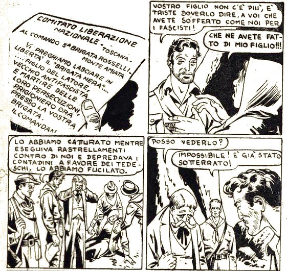 Molte delle fonti che ho consultato per scrivere queste note confermano che Camusso manteneva una grande fedeltà agli avvenimenti, senza nascondere nulla, come ben espresso in queste significative quattro vignette tratte da Il figlio fucilato (via nicoladagostino.net):