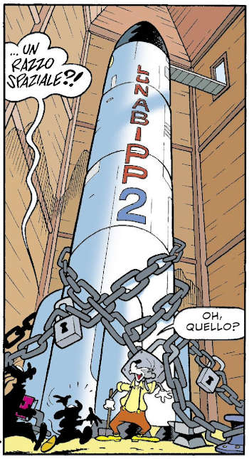 Per festeggiare nel modo migliore il cinquantesimo anniversario dell’allunaggio dell’Apollo 11, Topolino ha pensato bene di proporre ai lettori una storia in due parti ambientata proprio sulla Luna. Così ecco il thriller fantascientifico Il castello sulla Luna scritto e disegnato da Casty e ampiamente anticipato con un’intervista all’autore sul numero della settimana precedente. Sono molti gli elementi interessanti della storia di Casty, alcuni puramente legati al mistero da risolvere, altri essenzialmente scientifici. Andiamo con ordine e partiamo dalla… Guida alla costruzione di un razzo spaziale Coprotagonista della storia insieme con Topolino e Pippo è lo zio di quest’ultimo Bippo de