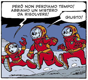 Per rendere ciò in maniera efficace Casty nella seconda vignetta di pagina 31 inserisce sotto Topolino & company una leggerissima linea cinetica che da il senso di una camminata fluttuante, mentre le nuvolette sotto i piedi danno l’idea della presenza di polvere sulla superficie del nostro satellite.