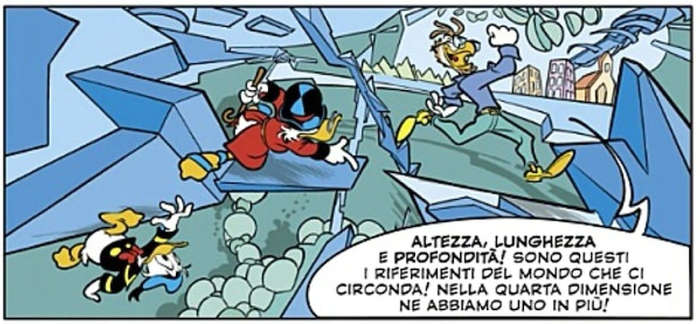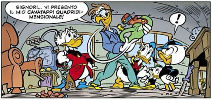 La storia di Artibani e Natalini, come ormai tutte le storie della serie di Topolino Comics&Science, presenta un’ottima gestione tra i momenti di spiegazione scientifica espliciti all’azione e alla meraviglia pure in una storia di stampo fantascientifico come Il cavatappi quadridimensionale. Peraltro tale modo di scrivere ha, secondo me, positivamente influenzato lo stile stesso di Artibani, come mostrato in altre occasioni negli ultimi anni ogni volta che lo sceneggiatore romano ha utilizzato la scienza nelle sue storie. Ottima, come al solito, la caratterizzazione dei paperi, ma lascia un po’ perplessi proprio Phil Gallis. Quest’ultimo viene caratterizzato come una sorta di Archimede Pitagorico e l’unica motivazione che giustifica la sua presenza è l’omaggio allo stesso Figalli. Forse, anche a costo di gestire un personaggio in più, sarebbe stato più sensato affiancargli proprio Archimede come esecutore materiale del progetto di Phil Gallis. A parte quello che potremmo comunque considerare un difetto veniale che non incide sulla piacevolezza della storia, quest’ultima risulta efficace in ogni sua parte, sia per quel che riguarda le informazioni che fornisce, peraltro parzialmente approfondite nell’intervista a Figalli che precede la storia, sia per quel che riguarda il ritmo narrativo.