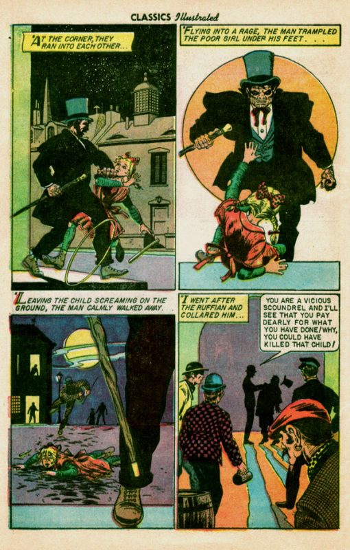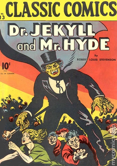 Il modello più remoto, probabilmente, va nel precoce adattamento dei Classic Illustrated del 1941, che presentano Hyde al numero 13 della collana (naturalmente citato da Wertham nel suo pamphlet contro i comics del 1954). Ingenuo e rozzo, in alcune tavole tuttavia anche questo grossolano adattamento conserva una sua efficacia, ed è inevitabilmente costretto a sua volta a mediare tra estetica gotica e cupa e l’uso dei colori primari a cui è costretto tecnicamente, non per scelta stilistica.