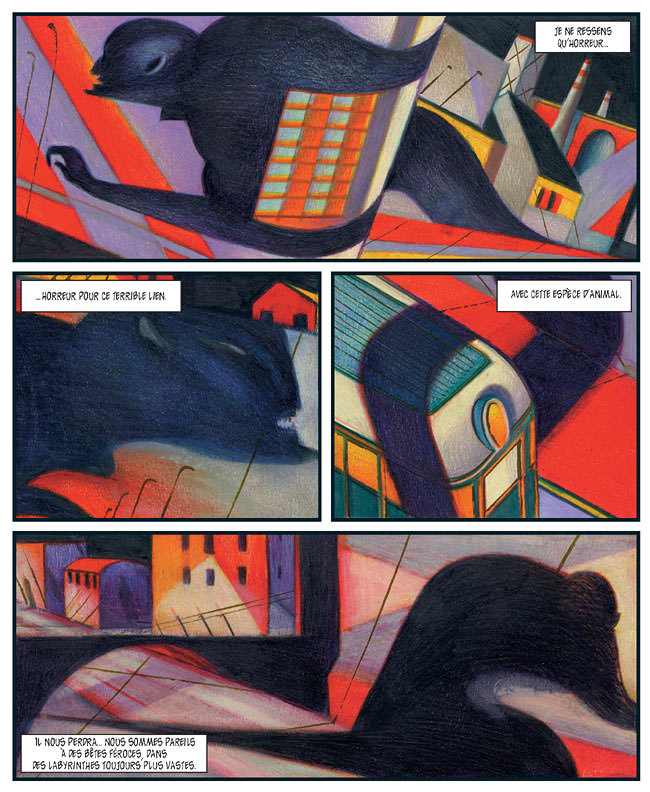 Il colore tuttavia, benché vivace, non rifugge del tutto da una certa cupezza: la grande massa nera di Hyde si staglia spesso come un’ombra oscura che domina e risignifica la scena. E allora anche i rossi accesi divengono un rosso sangue, e i viola un presagio lugubre e mortifero. Però, nel suo insieme, la tavola mantiene una sua eleganza di pulizia formale in cui le masse tendono quasi a tramutarsi in puro colore, come sghembe forme geometriche di una tela di Mirò. Aiuta anche l’adozione di una griglia in apparenza tradizionale, squadrata, su tre strip di modello italiano, spesso con l’adozione di una struttura “a mattoncino”, usata però in modo innovativo in questa intersezione costante coi segni e le linee interne alle vignette, quasi a comporre un solo e intersecato effetto d’insieme.