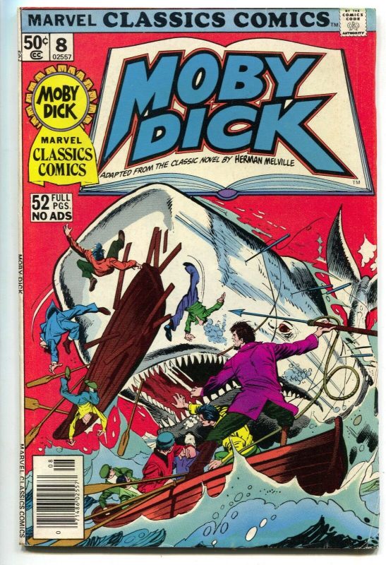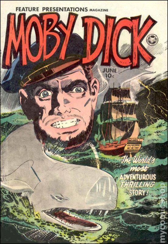 Moby Dick è piaciuto infatti molto anche al fumetto: è infatti uno dei primi adattamenti letterari dei comics, se prendiamo come punto di partenza i Classici Illustrati del 1946, dove appare al numero 5 della collana (di cui ho parlato complessivamente qui). Non poteva non piacere: da un lato era – in USA – il romanzo “alto” per eccellenza, nobilitante per il genere del fumetto allora alla disperata ricerca di sdoganamento, dall’altro era – in una prima lettura ingenua – un classico avventuroso, con un grande scontro titanico tutto sommato facile da spettacolarizzare (falsandolo).