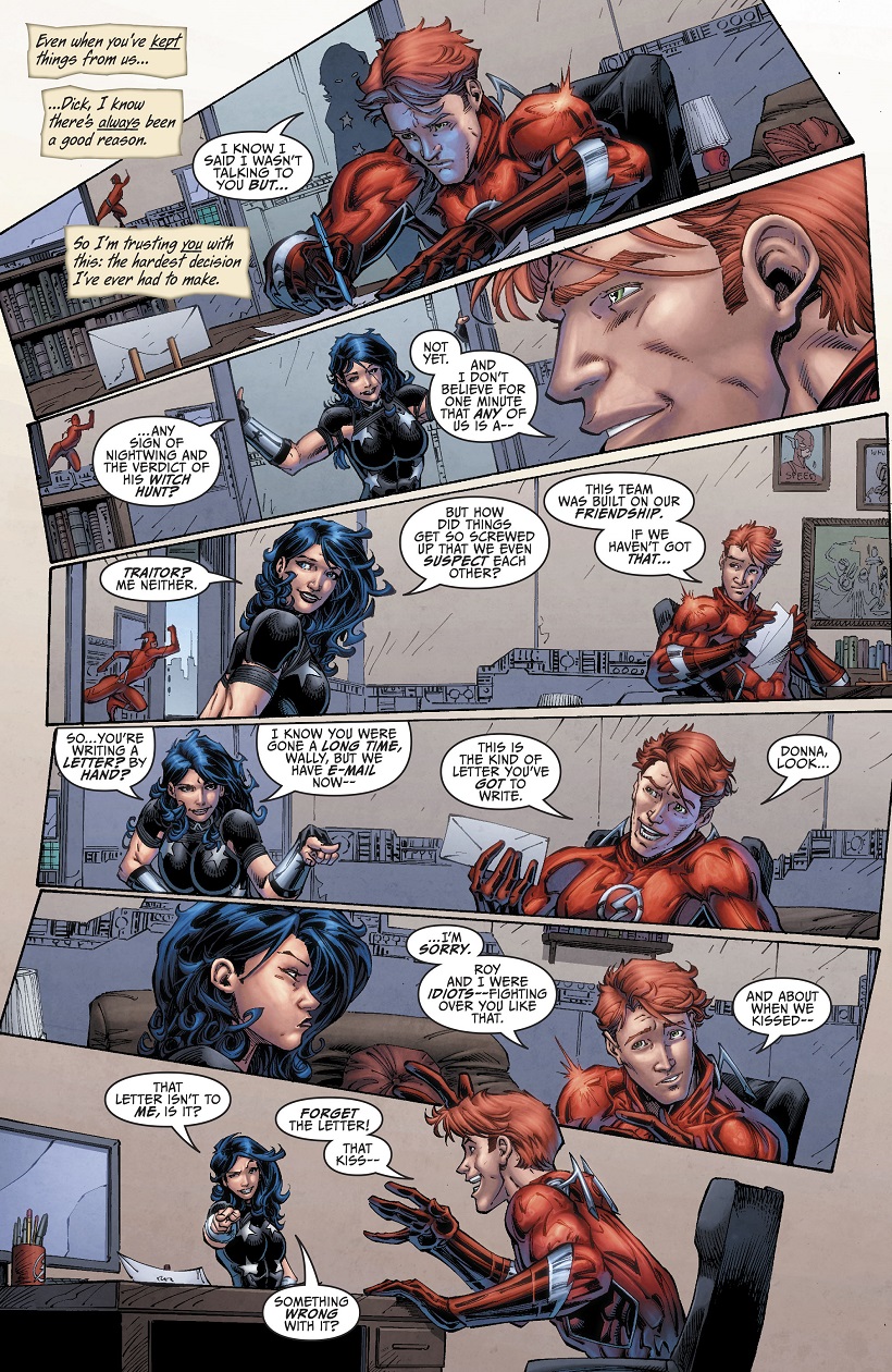 In una tavola con due persone che parlano è davvero necessario o funzionale questo layout? È necessario sbilanciare il tutto per dare una parvenza di azione a una scena che non ne prevede? Che lo sia o meno sembra evidente che Booth, così come avrebbero fatto anche Liefeld e Bay, se ne frega.