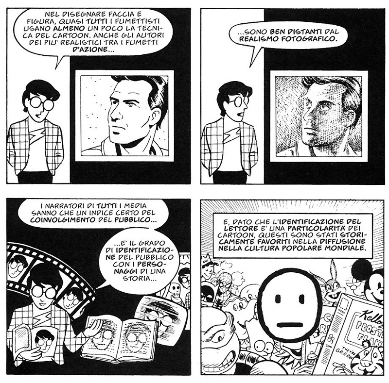 Come ci insegna Walt Disney la tecnica del cartoon, che è all’antitesi del fotorealismo, è quella che maggiormente permette il processo di identificazione del lettore con i personaggi: più il fumetto presenta dei dettagli realistici, che siano frutto del colore o di un maggior numero di linee, più sarà difficile per chi leggere vedere sé stesso nel personaggio che ha di fronte.