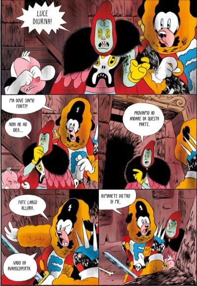 Importante sottolineare la costruzione della pagina e il montaggio delle vignette: di frequente la gabbia è composta da sei vignette quadrate, a volte spezzate da vignette orizzontali lunghe o che vanno a occupare mezza pagina, nel caso in cui più di due personaggi sono in campo oppure si vuole enfatizzare la scena. Questa scelta di Mò stimola l’immaginazione del lettore nel balzo da una vignetta all’altra, visto che alcuni movimenti dei personaggi che ci si potrebbe aspettare vengono saltati, ampliando lo scarto di tempo tra due vignette consecutive, costringendo il lettore a visualizzare più di un semplice gesto singolo nei passaggi tra le vignette che si susseguono.