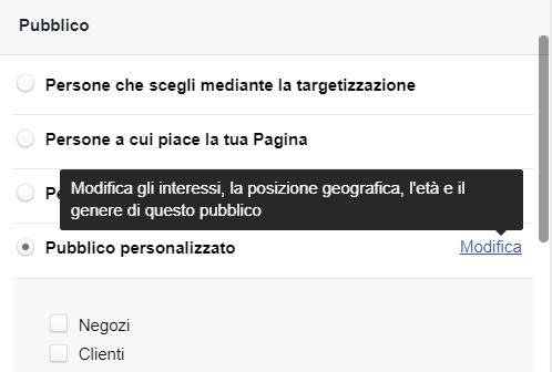 Anche se hai molti fan, selezionare “persone a cui piace la tua pagina” o “persone a cui piace la tua pagina e i loro amici” potrebbe essere davvero molto meno efficace di definire un pubblico personalizzato.