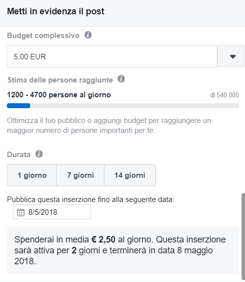Facebook, in base al budget destinato alla promozione, ti fornisce una forbice indicativa del pubblico a target che sarà in grado di raggiungere all’interno del suo network. La differenza per una performance migliore della tua inserzione (ovvero: più persone raggiunte a parità d’investimento) è la qualità del testo e del contenuto visivo che avrai preparato.