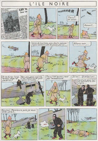 Prima tavola de L’isola nera, sesta avventura scritta da Hergé: Tintin passeggia con Milou. Nel cielo, un piccolo aereo sta soffrendo un qualche guaio meccanico che lo costringe ad atterrare. Tintin lo raggiunge e nota che l’aereo è privo di identificazioni. I piloti, scesi a terra e affannati nel tentativo di far ripartire il mezzo, si accorgono dell’intruso e fanno fuoco. Tintin, colpito, cade a terra esanime.