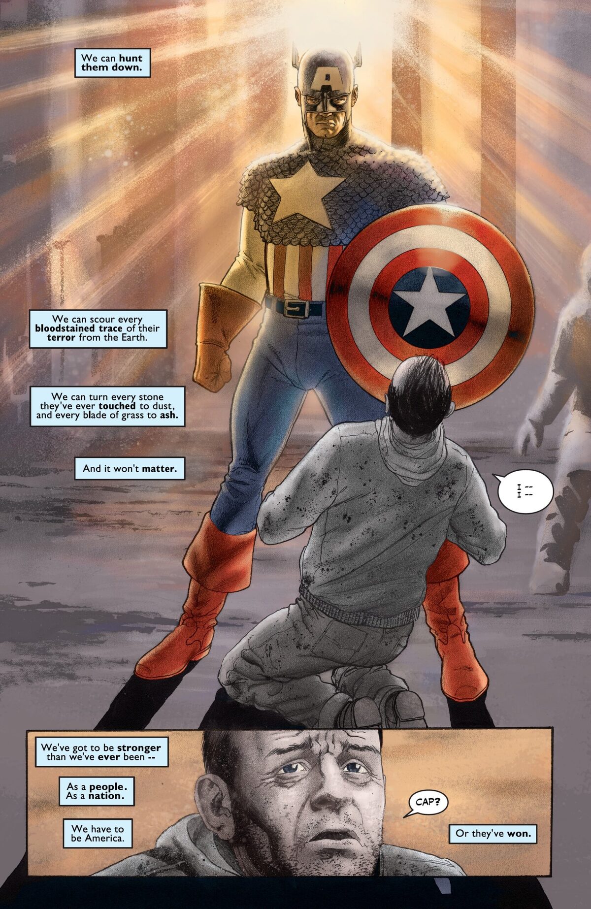 Captain America: The New Deal #1 – Dust (tav. 21) di John Ney Rieber & John Cassaday (Marvel Comics, 2002 – Pubblicazione italiana: Marvel Must Have – Capitan America: Il New Deal, 2023)