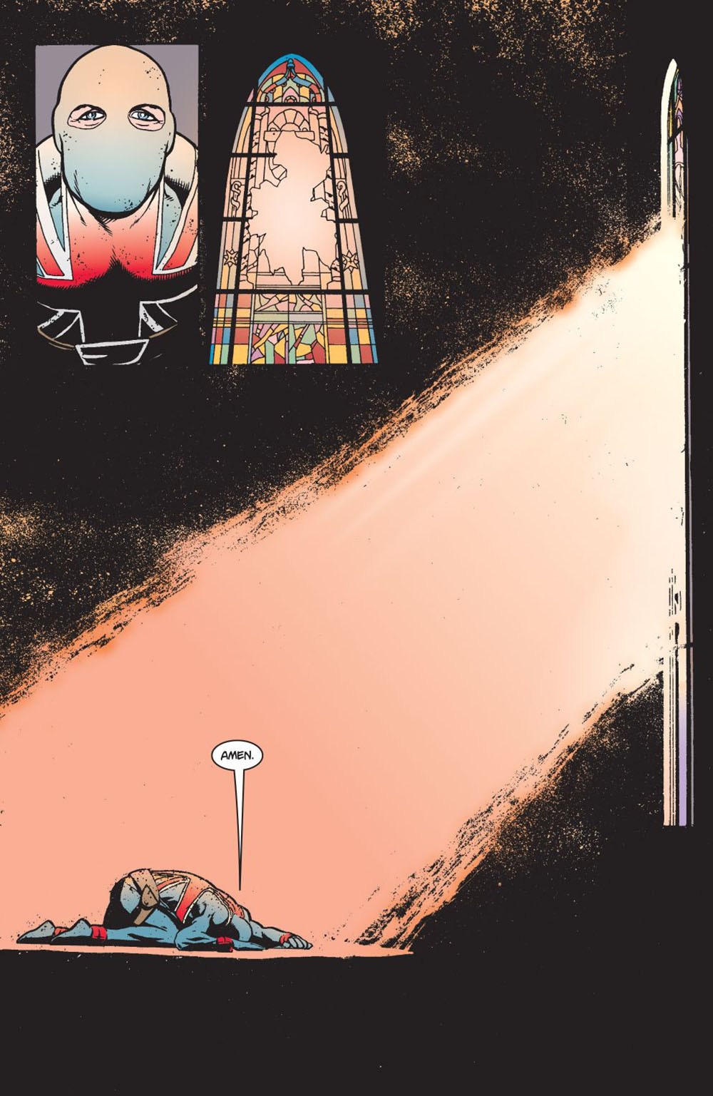 Anello di congiunzione tra Capitan Bretagna e Blade, Union Jack è uno di quei personaggi minori di Marvel Comics che nel corso degli anni ha attraversato diverse incarnazioni, corrispondenti a diversi rilanci editoriali. L’eroe che indossa la bandiera inglese come costume e combatte i vampiri arriva dall’universo degli eroi impegnati durante la seconda guerra mondiale. John Cassaday si occupa di rilanciarne la terza incarnazione, in cui l’alter ego dell’eroe si chiama Joseph Chapman, con una miniserie del 2013, in cui non si limita solo ai disegni, ma realizza anche dei testi in collaborazione con Ben Raad. Cassaday si approccia al racconto cercando con forza l’impatto sul lettore. Le scene d’azione sono sincopate e cercano inquadrature e prospettive ardite, con uno storytelling estremamente chiaro e d’effetto anche negli scontri più caotici. La tavola 10 del primo episodio dei tre che costituiscono la miniserie però è esplicita nel raccontare le intenzioni del suo autore, che non sono quelle di concentrarsi su azione e adrenalina. È praticamente una splash page costruita con il minimo possibile: lo sfondo è quasi inesistente e sulla scena appaiono solo il protagonista – un primo piano nella vignetta di apertura e lui prostrato nel resto della tavola – una vetrata e un fascio di luce. C’è un solo balloon e una sola parola: Amen. Il personaggio occupa per altro uno spazio molto ridotto dell’immagine, è piccolo, in un angolo. L’effetto finale è dirompente, umano e di grande impatto emotivo che colpisce anche l’osservatore che la trova così, estrapolata, ma che corona e spiazza nel finale di una sequenza d’apertura che rende memorabile. Proprio nelle pagine precedenti Cassaday ci ha mostrato tutta la sua capacità di stupire, di caricare di elementi e dettagli le tavole tra iperboli e belle immagini: qui invece dimostra la forza e il coraggio di costruire un culmine narrativo nella totale sottrazione dell’essenziale.
