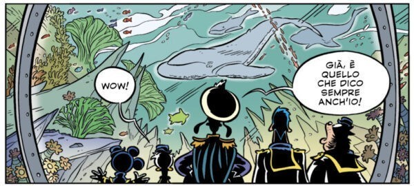 La storia, uscita originariamente su Topolino #3355 e #3356 nel marzo 2020 – per celebrare i 150 anni dalla prima pubblicazione del romanzo 20.000 leghe sotto i mari – viene oggi riproposta da Panini Comics in versione deluxe: questo significa un formato doppio rispetto ai volumetti originali e anche l’occasione per qualche pagina di approfondimento extra con gli autori.