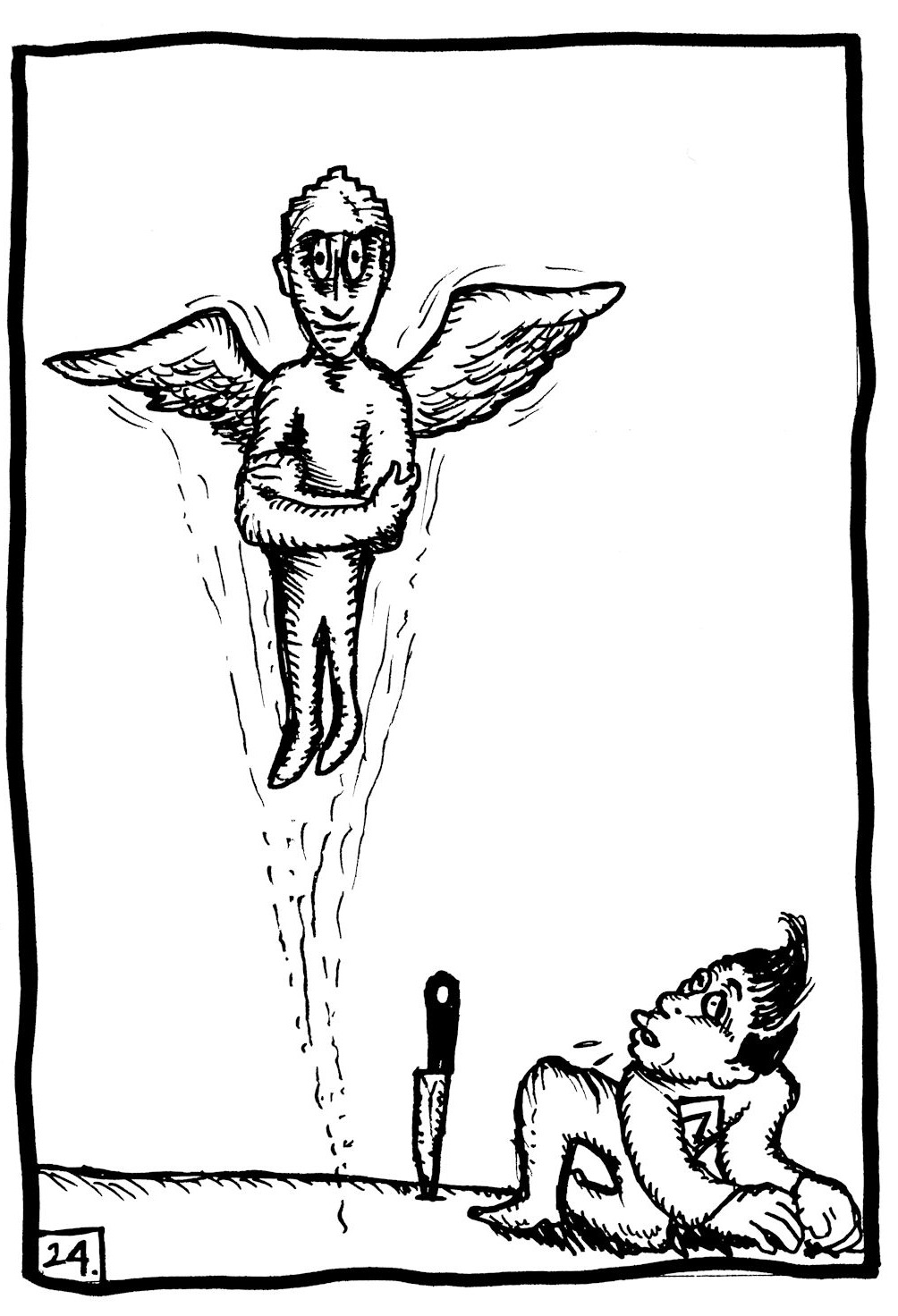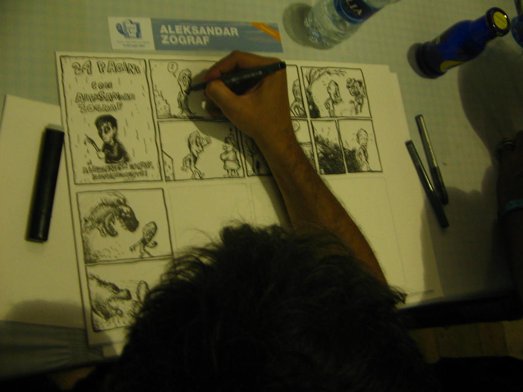 Aleksandar Zograf fu uno degli ospiti di eccezione di quella edizione della 24 Hour Italy Comics: fumettista e illustratore serbo, i suoi racconti oscillano tra grapich journalism e storie libere, come questo racconto simbolico che compose durate Italia Wave in 24 tavole originariamente disegnate 8 per pagina, minuziosamente incise del suo stile graffiante.