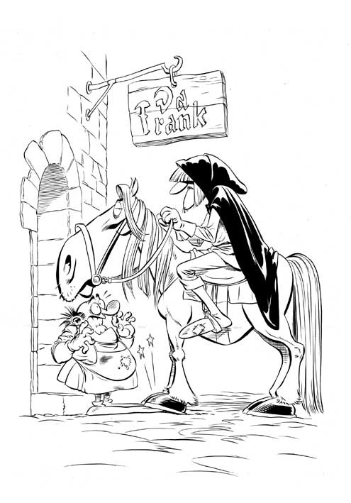 Circa due/tre giorni a tavola. Sono lento. Prima ero molto più veloce, mi ponevo meno problemi ed usavo i pennarelli per le inchiostrature (i Nestler, i migliori ed insuperati; talmente buoni che non li fanno più. Chissà perché!). Poi un amico mi suggerì di provare l’inchiostratura a pennello: scoprii così i pennelli Windsor&Newton, con l’inchiostro omonimo. E non li ho più abbandonati. Faccio tutto a pennello ed il pennarello lo lascio per i dettagli architettonici o che non necessitano di un tratto modulato.