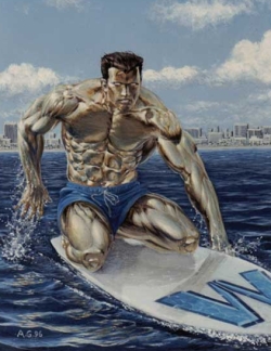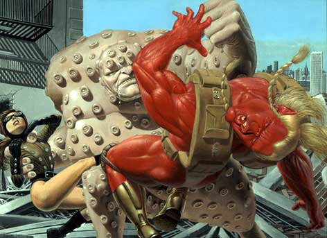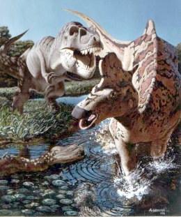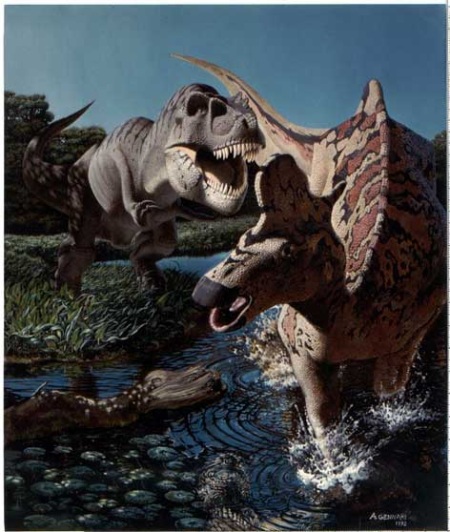 A-ah! Sul succo di pomodoro sei male informato! No, in realtà è andata così: dovevo dipingere “Barbarian”un personaggio di una serie a fumetti della “Image”; questo “tizio” è una specie di gigante dalla pelle rosso acceso. Non sapendo come rendere l’effetto traslucido di quella pelle, con i riflessi, le trasparenze, trovai che ritrarre un pomodoro maturo fosse la cosa migliore… e così è stato. Documentandomi sulle tecniche usate dai grandi illustratori americani, ho poi scoperto che i migliori di loro usano ritrarre dei modellini di animali preistorici, per azzeccare con precisione le luci e le ombre. E così ho cominciato anch’io a costruire i miei modellini: faccio poco più che degli abbozzi, in das o altri materiali “veloci”, li metto in posa, scatto una foto ed è fatta. In fondo, perfino i grandi artisti del passato, non si servivano forse di modelli viventi? Certo che sì… Qualcuno si è pure sposato la modella! I miei modelli, invece, non esistono più da milioni di anni, ed avrebbero comunque dimensioni intrasportabili in uno studio di pittura. Così, meglio usare dei modellini in scala. Per la fase di pittura, ho usato molti anni la tempera acrilica: asciuga in fretta, è economica ed è disponibile in un’ampia gamma di colori. Ha però l’inconveniente di essiccare in modo rapido, le sfumature sono difficili da ottenere ed una volta secco il colore non si scioglie più: è irreversibile ed il colore composito è difficile da rifare uguale. Il colore ad olio, invece, si mantiene fresco e lavorabile a lungo, per fare le più delicate sfumature, con qualche accorgimento si può conservare il colore composto per un certo tempo. Non dipingo su tela, ma su cartoncino, è più fine, i dettagli minuti risultano al meglio (per i soggetti che dipingo, i dettagli sono essenziali). La pittura ad olio, però, si diluisce con solventi che, specie in estate, col caldo, evaporano con esalazioni non proprio balsamiche. Recentemente, quindi, ho sostituito la tavolozza materiale con quella virtuale: ho un bel pc assemblato, con una tavoletta grafica Wacom, con cui sto dipingendo molte illustrazioni. Anche i libri di Detti e Fiori, di cui sopra, li ho dipinti alla Wacom. Ed ora sto preparando una serie d’illustrazioni su faune preistoriche, sempre in pittura digitale. Molti storcono il naso, a sentir parlare di pittura al computer. Lo facevo anch’io. Ma è comoda in pratica, risparmi moltissimo tempo. Lo stesso soggetto, una volta fatto, lo puoi riciclare, modificare, spostare, senza dover ogni volta rifare tutto. L’aerografo elettronico non s’intasa mai, non fa rumore, non sporca. E se non ti piace quel che hai dipinto Ctrl+alt+z e tutto torna com’era. I tempi cambiano, bisogna adeguarsi. Forse un giorno la pittura digitale avrà la stessa dignità artistica che riserviamo oggi ad un’altra forma d’arte “seriale”: la fotografia.