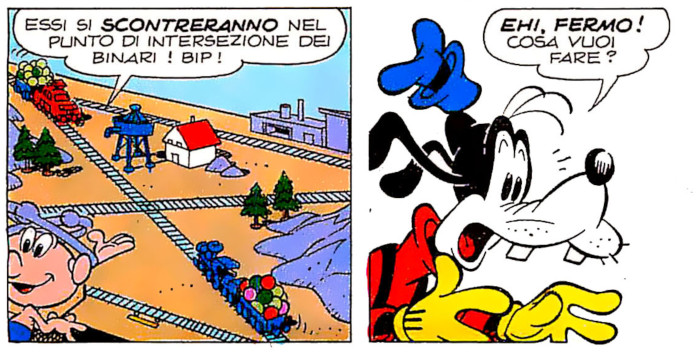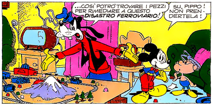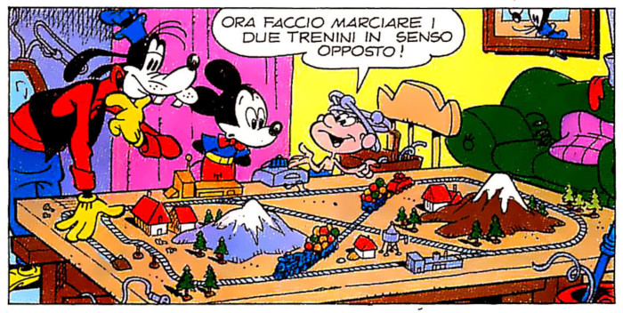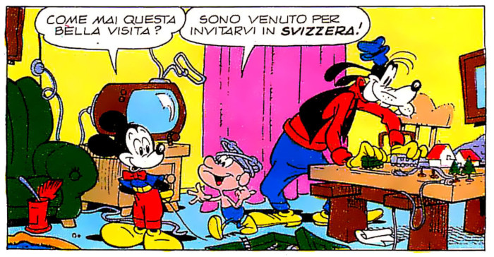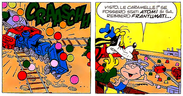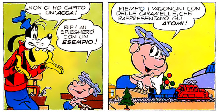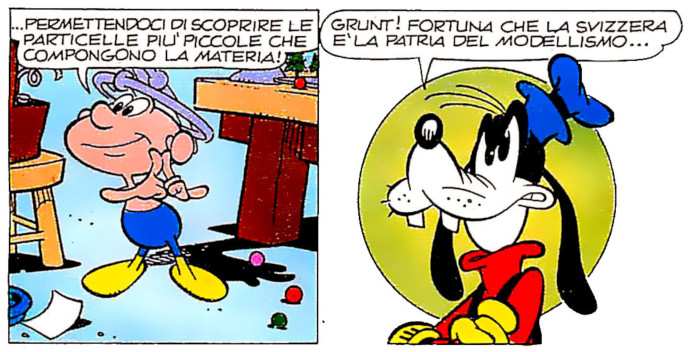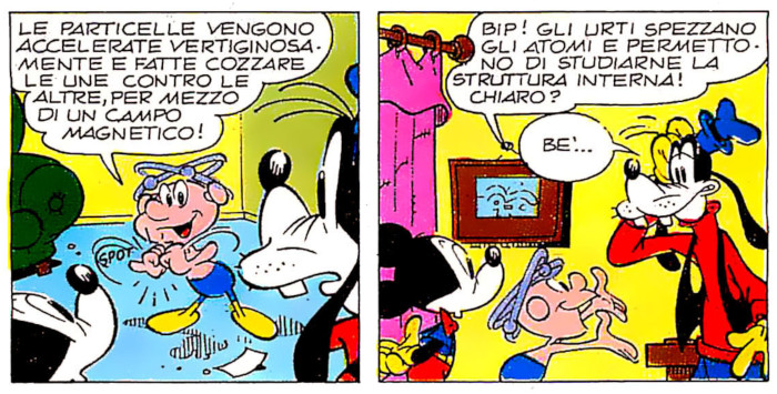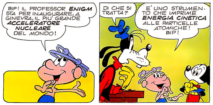 Anche se con un giorno di ritardo ((Causa Cartoomics 2019)) sulla data ufficiale ((Il Topolino #206 su cui venne pubblicata per la prima volta La dimensione delta è datato 10 marzo 1959)), festeggio i sessant’anni dalla creazione di Atomino Bip Bip ad opera di Romano Scarpa proponendo una serie di vignette tratte da Topolino e l’acceleratore nucleare, storia pubblicata su Topolino #1563 del 1985. Scritta da Alessandro Bencivenni ((Lo sceneggiatore ha rievocato la genesi della storia su asimmetrie, rivista dell’Istituto Nazionale di Fisica Nucleare)) per i disegni di Massimo De Vita, porta Topolino, Pippo e Atomino, come spiegato molto bene da quest’ultimo, in Svizzera dove il professor Enigm sta per inaugurare il più grande acceleratore di particelle del mondo. Ovviamente, anche se non in maniera esplicita, il riferimento è al LEP, ovvero Large Electron-Positron Collider, l’acceleratore di particelle della generazione precedente all’attuale LHC, Large Hadron Collider.