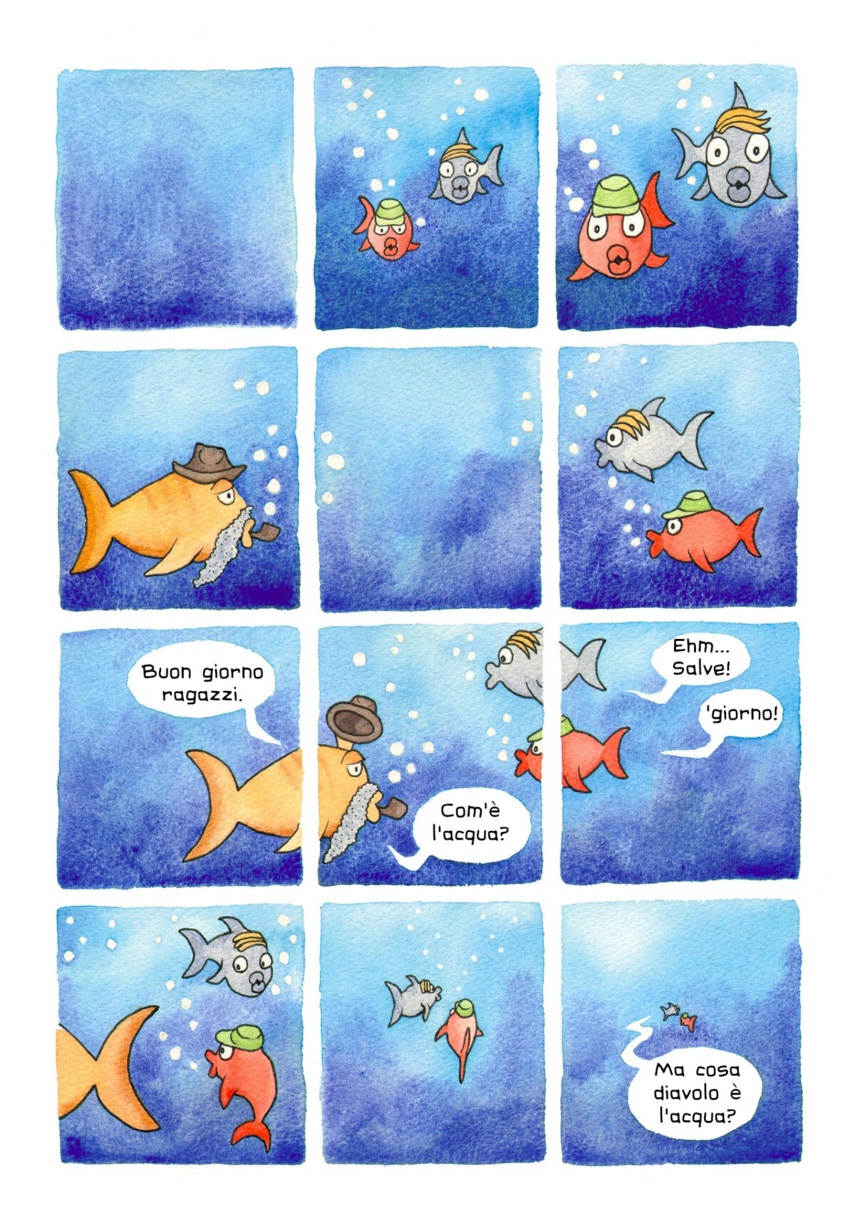 Passa all’incirca un anno, e succede che Andrea pubblica la traduzione di This is water, uno degli speech più noti e iconici di David Foster Wallace, compianto scrittore statunitense che aveva la matematica nel sangue, come dimostra il suo libro di divulgazione, Tutto, e di più, e il racconto autobiografico sul tennis e la trigonometria. E’ questo l’articolo con cui Roberto si avvicina ad Andrea, piuttosto che la partecipazione di entrambi alla mia edizione del Carnevale della Matematica, ma la cosa curiosa è che, non solo tutti e tre abbiamo un certo interesse nei confronti di DFW, ma che Davide Osenda, un anno dopo questi eventi, pubblica una one page sulla prima immagine evocata da DFW nel suo famoso This is water (la trovate qui sotto: c’ho aggiunto il lettering). E Davide è anche l’autore di Gottinga, che proprio Andrea (ma anche i Rudi Mathematici, che all’epoca pubblicarono una prima versione a bassa risoluzione dell’opera, ora non più disponibile) ha contribuito a far conoscere al grande pubblico, dando il via alla stagione del Comics&Science italiano.