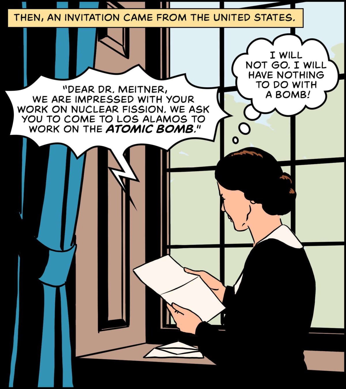 Era il 1942 quando Lise Meitner ricevette una lettera in cui la invitavano ad aderire al Progetto Manhattan con lo scopo di costruire una bomba. L’interesse verso la Meitner era legato al fatto che era un fisico nucleare, e anche di gran livello. Di fatto, nonostante il premio Nobel per tale scoperta andò, nel 1944, a Otto Hanh, il contributo suo e del nipote Otto Robert Frisch alla comprensione del fenomeno fu fondamentale. E di fatto la teoria della fissione nucleare è contenuta nel loro articolo, uscito nel febbraio del 1939, a completamento dei due articoli di Hanh e del suo assistente Fritz Strassman.