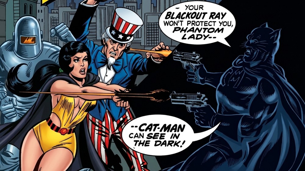 Wein e Dillin in quell’albo stabilirono che i Freedom Fighters vivevano su una terza terra parallela dove i nazisti avevano vinto la seconda guerra mondiale. A questo status quo si opponevano proprio Uncle Sam e gli altri componenti del gruppo, tutti nati esattamente nel periodo a ridosso di quel conflitto, i cui echi sono alla base della storia d’esordio di Phantom Lady, il personaggio di cui andremo a trattare quest’oggi.