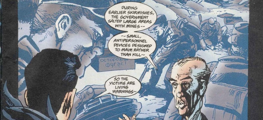 Death of innocents: the horror of landmines di Dennis O’Neil e Joe Staton con le illustri chine di Bill Sienkiewicz venne originariamente pubblicato nel 1996 (in Italia ha avuto due edizioni, una nel 1997 su Play Magazine #21, e l’altra in volume unico nel 2015), nel pieno della guerra in Jugoslavia. I riferimenti a quella guerra, per quanto O’Neil cambiò l’ambientazione descrivendo una guerra civile nel regno immaginario della Kravia, erano abbastanza evidenti, considerando l’attualità dell’epoca, tra l’altro particolarmente vicina per noi europei.