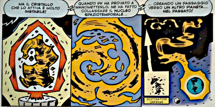 Come visto nelle prime pagine di Un nuovo eroe di Roberto Gagnor e Alberto Lavoradori, Paperinik salva la giornata paperopolese impedendo la distruzione della sua città a causa di un’astronave in caduta libera su Paperopoli. Non mi dilungo sui tempi stretti con cui Paperinik è dovuto intervenire, o sul fatto che già solo questa minaccia avrebbe costituito un ottimo soggetto per una storia (chi ha detto Armageddon?) ma vorrei soffermarmi su quanto detto da Uno a Lyla relativamente alla scomparsa di Paperinik alla fine della sua azione di salvataggio: è stato teletrasportato su un altro pianeta nel passato!
