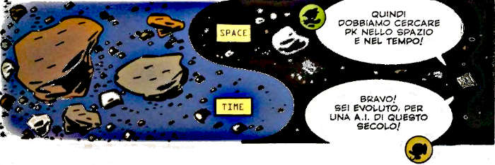 Al di là della già strana affermazione di Uno, questa serve però all’intelligenza artificiale per spiegare a Lyla che Paperinik va cercato nello spazio e nel tempo, il che è una incredibile ovvietà, ed è proprio quello che cercherò di spiegarvi nel seguito.