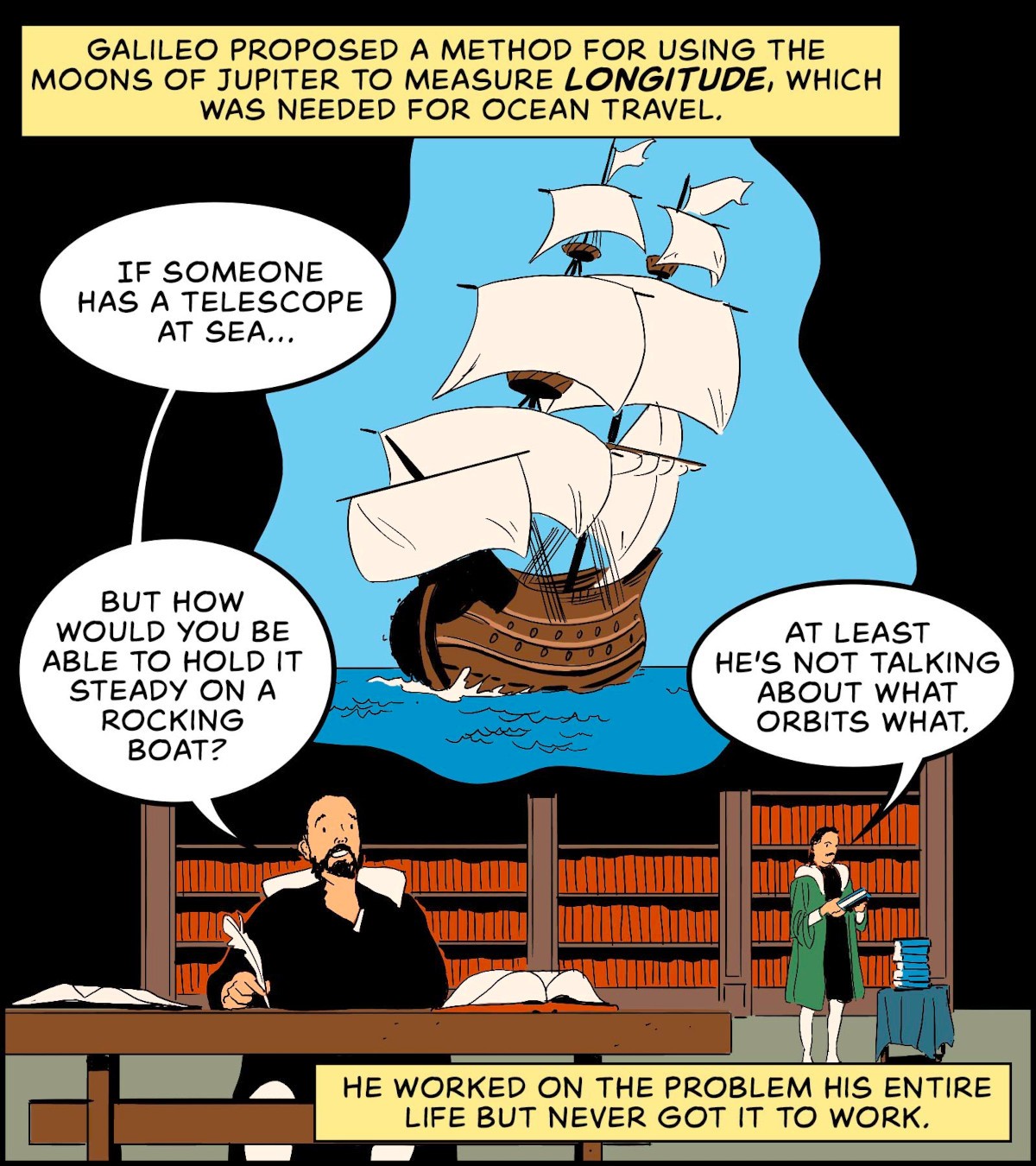 Una interessante questione accessoria cui Galileo lavorò praticamente per tutta la vita legata proprio alla scoperta delle lune di Giove, fu la determinazione della longitudine in mare. Determinare la posizione durante la navigazione era, in effetti, importante per ridurre i tempi di percorrenza delle tratte navali, evitando le rotte parallele alle coste. Quella della risoluzione di questo problema è, come si suol dire, un’altra storia, che il buon Galileo non riuscì mai a risolvere, nemmeno utilizzando le lune di Giove.