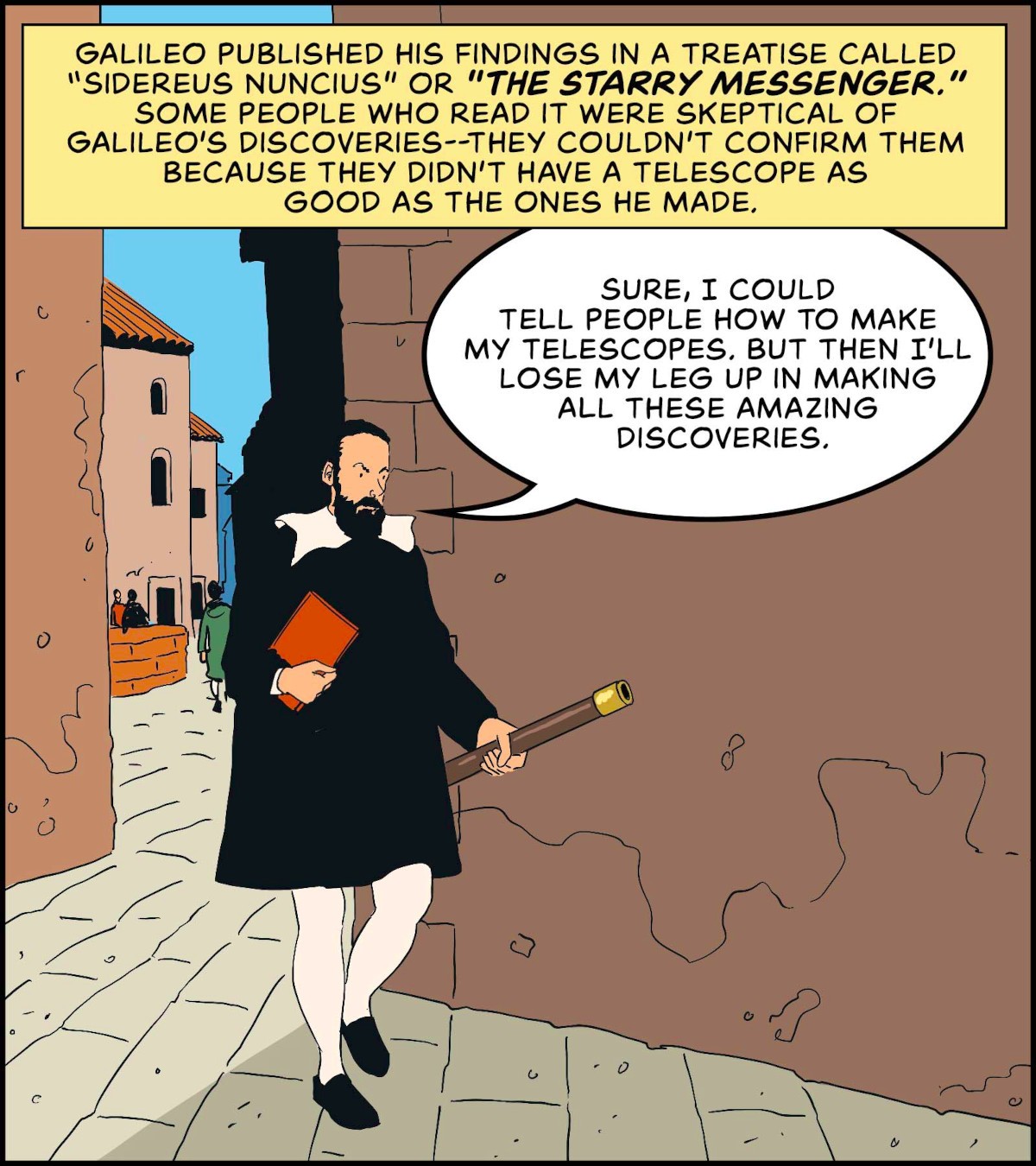 La scoperta delle lune da parte di Galileo Galilei, che vediamo rappresentata nella vignetta di Sarah Zielinski e Jack Richardson, aveva una particolare importanza innanzitutto per scardinare alcune convinzioni piuttosto radicate all’epoca, su tutte quella che tutti i corpi dell’universo ruotavano esclusivamente intorno alla Terra. Osservare che, invece, intorno a Giove ruotavano dei corpi più piccoli, più o meno dello stesso ordine di grandezza della Luna, come sappiamo oggi, era il primo passo per iniziare a introdurre il discorso verso il modello eliocentrico.