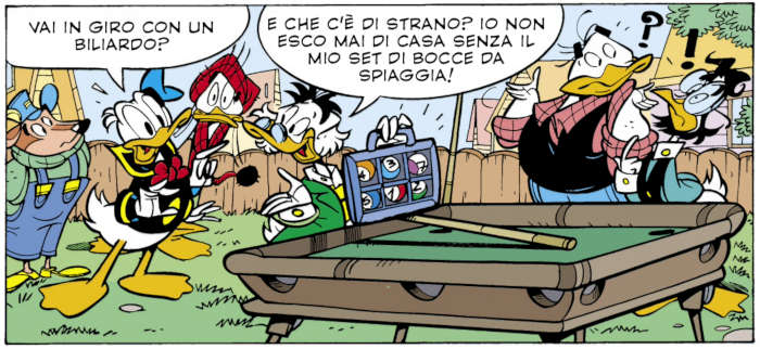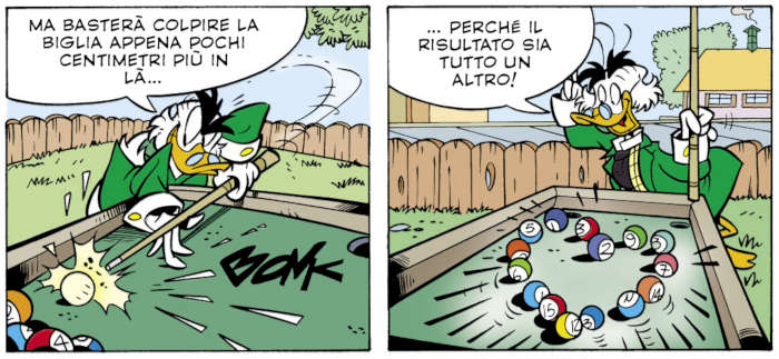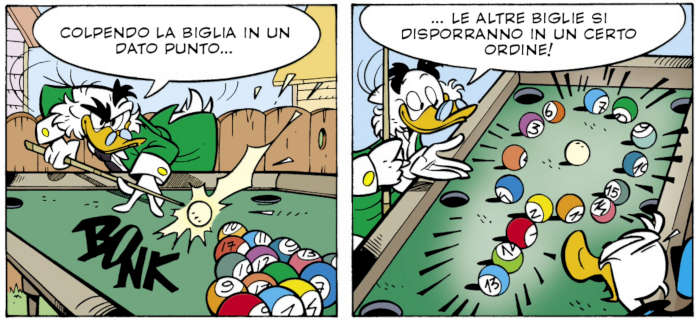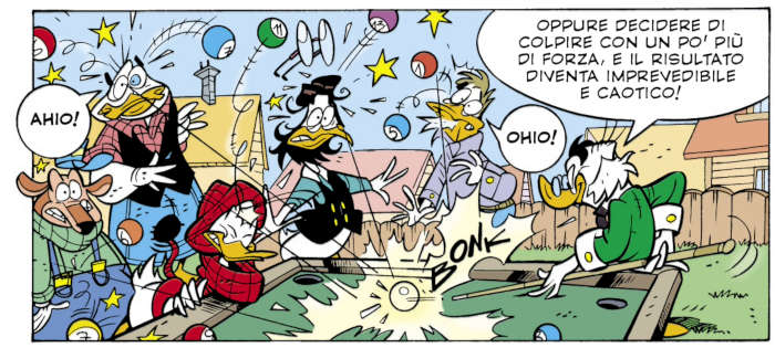 Vitaliano, con un’efficacia che non ha mostrato in occasione della spiegazione dell’effetto tunnel, utilizza il personaggio in una sequenza di un paio di paginette per spiegare con efficacia la teoria del caos utilizzando il biliardo.