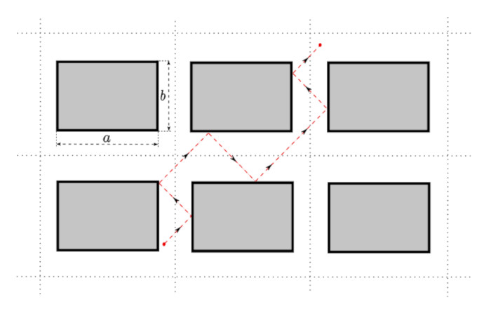 Il biliardo dinamico, però, non ha finito di stupire i matematici. Prendiamo il modello degli Ehrenfest. Proposto nel 1907 da Paul Ehrenfest e dalla moglie Tatyana Afanasyeva per spiegare il secondo principio della termodinamica, considera N particelle in un contenitore diviso in due zone. Le particelle passano da una zona all’altra in maniera indipendente secondo un certo tasso di scambio. I due fisici, però, non si accontentarono di questo modello e nel 1912 proposero una sua variazione, il wind-tree model(3), ovvero un gas che si muove all’interno di un contenitore infinito ma con degli ostacoli rettangolari al suo interno.