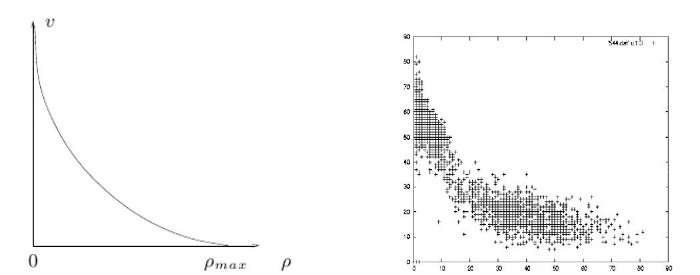 Se, però, pensiamo al traffico su un tratto di strada sufficientemente lungo, possiamo pensare che ci vogliano un certo numero di veicoli per ottenere un abbassamento apprezzabile della velocità di percorrenza. Un andamento di questo genere, ovvero una situazione in cui la velocità si mantiene costante anche all’aumentare della densità, per poi iniziare a diminuire, con la presenza di una densità critica oltre la quale il traffico va considerato fermo, è molto simile a un sistema che sta subendo una transizione di fase. E non a caso esistono alcuni approcci al problema che utilizzano proprio le equazioni delle transizioni di fase(2).