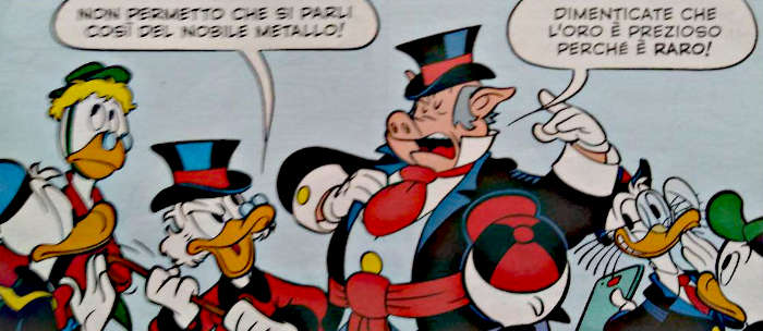 Come ricorda il sindaco di Paperopoli prima dell’ultima parte de La marea aurea, l’oro è prezioso perché raro. In effetti l’oro è prodotto in alcuni tra i più rari e potenti eventi cosmici. Il motivo è legato al suo peso atomico, particolarmente elevato. Ricordiamo molto brevemente gli elementi essenziali della teoria della nucleosintesi: le condizioni di energia e densità presenti nei primi istanti di vita dell’universo erano tali che vennero prodotti solo nuclei e atomi di idrogeno ed elio, con alcune piccolissime tracce di litio. Gli atomi più pesanti, invece, vennero prodotti successivamente all’interno dei nuclei delle stelle. Anche in questo caso, però, le condizioni interne, combinate con l’equilibrio tra l’attrazione gravitazionale e la radiazione del plasma stellare, permetterebbero la creazione di atomi fino al ferro. Questi sarebbero poi diffusi nel resto dell’universo grazie all’esplosione di stelle particolarmente grandi, dette supernove. Gli elementi più pesanti del ferro vengono, invece, prodotti in eventi noti come kilonove, ovvero collisioni tra oggetti celesti particolarmente massici come due buchi neri e, soprattutto, due stelle di neutroni. In questo caso le condizioni presenti durante la collisione sono tutte esattamente quelle necessarie per produrre gli elementi più pesanti del ferro, come appunto l’oro.