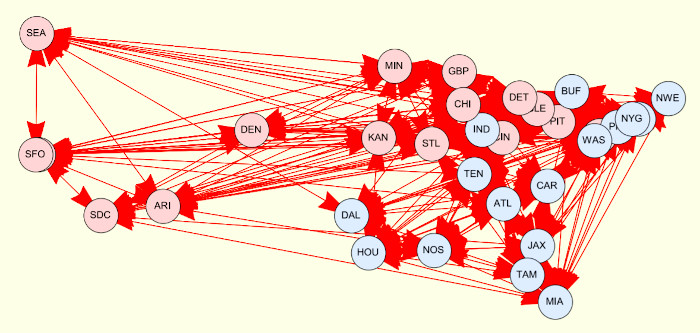 Partiamo, però, da un parente stretto del rugby, il football americano. Tra il 2014 e il 2016 ha militato presso i Baltimore Ravens un ragazzone canadese di nome John Cameron Urschel nei ruoli di guardia e centro. Urschel, però, aveva anche altre due passioni: gli scacchi e la matematica. Se giocare a scacchi non è qualcosa di particolarmente complicato anche per un giocatore di football, coltivare la passione per la matematica non è altrettanto semplice, soprattutto se chi lo fa non vuole che la sua carriera in quest’ultimo campo sia di tipo amatoriale. Così Urschel ha stretto i denti e, nel corso della sua breve carriera da footballer ha conseguito nel 2016 un dottorato in matematica presso il Massachssets Institute of Technology, o semplicemente il MIT. I suoi campi di interesse sono la teoria dei grafi, l’algebra lineare numerica e il machine learning. Ed è proprio la teoria dei grafi che Urschel, insieme con Ludmil Zikatanov(1, 2), ha applicato per studiare la stagione 2015 della NFL: