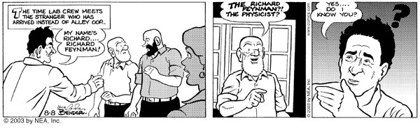 La striscia di Alley Oop, nome del protagonista indiscusso della serie, ideata da Vincent Trout Hamlin, apparve per la prima volta sui quotidiani statunitensi il 7 agosto del 1933. Alley è una sorta di uomo di Neanderthal del regno a metà preistorico a metà fantastico di Moo. Dopo una serie di avventure nel suo regno, Alley si ritrova coinvolto in una serie di avventure temporali grazie alla macchina del tempo del professor Wonmug e del suo assistente Oscar Boom. Proprio durante una delle missioni temporali di Alley (in realtà una festa a sorpresa per il suo compleanno), un errore imprevisto porta nel 2003 al posto del’uomo preistorico il fisico statunitense Richard Feynman, vincitore nel 1965 del premio Nobel per la fisica grazie al suo contributo all’elettrodinamica quantistica. Oggi Feynman avrebbe compiuto 100 anni, e oltre all’altra miriade di articoli pubblicati e segnalati quest’oggi, mi sembrava interessante scrivere due righe su questa curiosità fumettistica sul grande Feynman.