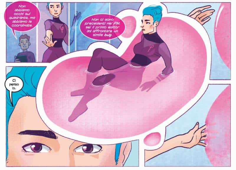 Ariel Vittori scrive, disegna e colora le vicende di Miranda, editor di realtà virtuali inviata a salvare tre avventati internauti dispersi nella rete. Nota per i suoi fumetti erotici e per aver fondato, insieme a Laura Guglielmo, l’etichetta Attaccapanni Press con cui è stata pubblicata l’antologia il Grimorio, l’autrice sembra non trovarsi a suo agio con il genere fantascientifico. Sarebbe stato interessante vedere il mondo cyberpunk ravvivato dalle atmosfere sensuali con le quali la Vittori ha già dato coraggiosa prova di eccellenti capacità espressive. La trama esile viene però notevolmente rinforzata dal ricorso a tavole dalla griglia libera, colorate efficacemente con toni shocking che rendono bene l’atmosfera dell’immersione nella rete.