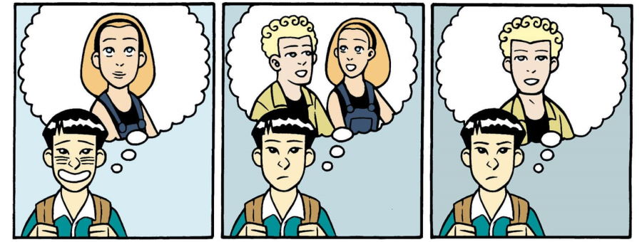 Il disegno di Gene Luen Yang è essenziale, sobrio e spesso incline, anche per esigenze narrative, allo stereotipo. Frequenti i primi piani e una certa staticità delle figure, l’autore raramente ricorre all’azione, che quando c’è ha i toni farseschi dei cartoon per bambini. Il colore è dato per tinte piatte, e l’assenza delle sfumature toglie profondità soffocando la prospettiva. Alcune vignette, se con molti personaggi, risultano caotiche eppure il risultato complessivo è elegante, maturo. I volti, espressivi seppur tratteggiati con poche linee, favoriscono l’immedesimazione e una certa empatia, necessaria per apprezzare un’opera che è diventata, in molte scuole, testo didattico. Un’immedesimazione a cui giova la naturalezza con cui viene dipinto il sentimento amoroso, quell’imbarazzo che accomuna tutti i ragazzi di tutte le estrazioni sociali e di tutte le culture. Quel sentirsi inadeguati di fronte alla persona cui siamo attratti e non avere una bussola che ci sappia dire come comportarci. Ecco che Gene Luen Yang dedica intere tavole al suo protagonista e al suo dramma di avere le ascelle sudate e per questo non poter abbracciare la ragazza di cui è innamorato mentre è al cinema. Non c’è cultura che tenga, in amore ci scopriamo tutti ugualmente imbranati.