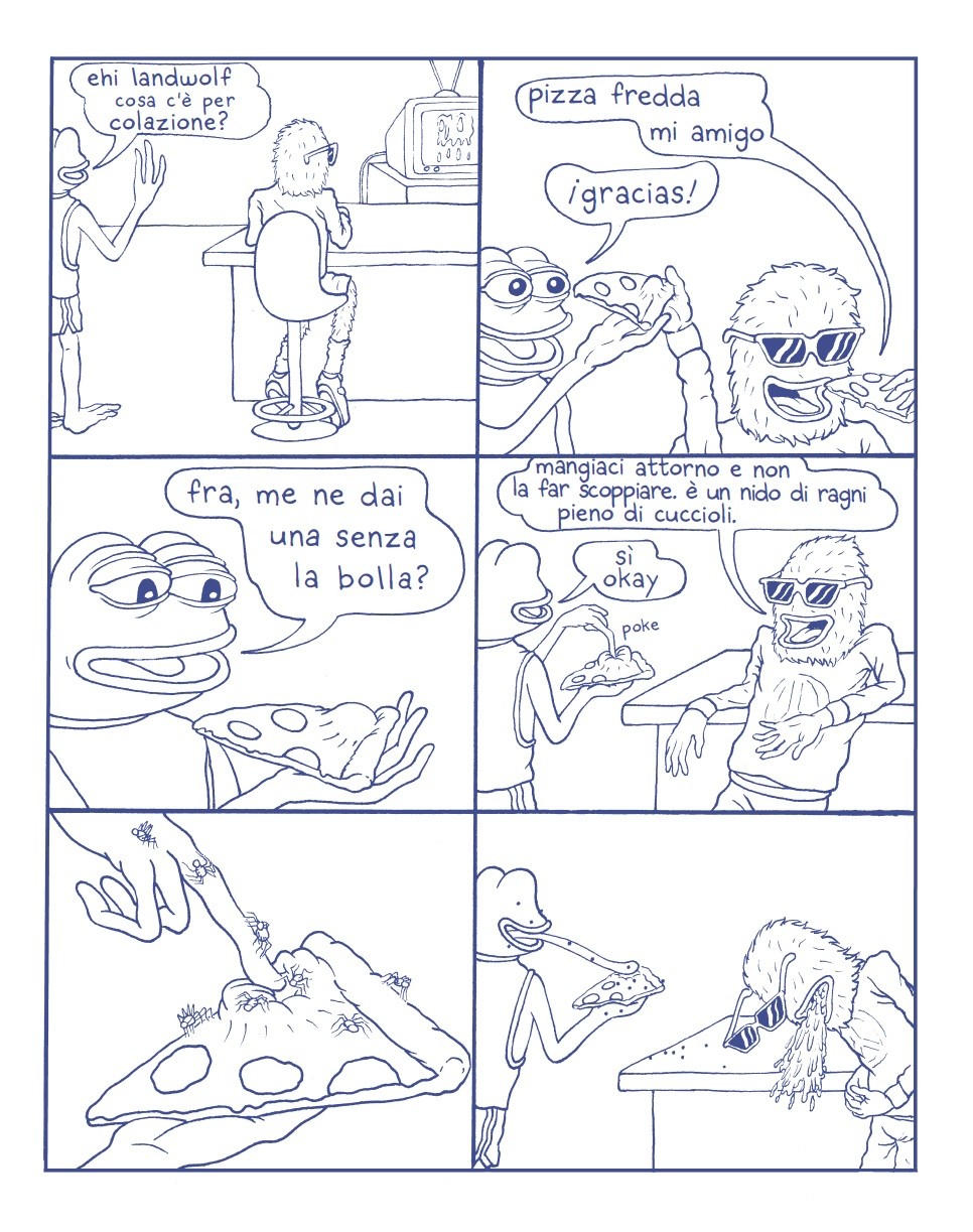 Molte persone senza saperlo conoscono visivamente uno dei personaggi protagonisti di questo fumetto: Pepe – the frog, diventato un meme prima su MySpace e poi sul sito per la condivisione di immagini 4chan, venendo modificato e riutilizzato migliaia di volte, sino a quando è stato rubato dall’alt right americana per diffondere messaggi razzisti e xenofobi costringendo il suo creatore a una lunga campagna pubblica e legale per “liberare” Pepe da quel tipo di utilizzo politico e appropriazionista e impedire all’estrema destra americana di usarlo ancora. Ora finalmente anche il pubblico italiano potrà conoscere davvero Pepe, seguire le sue gag con i suoi amici nella sua vera casa e scoprire l’incredibile talento di Matt Furie.