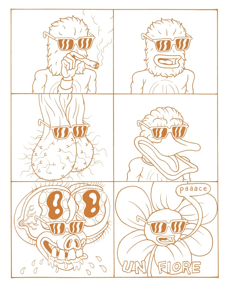 Il segno grafico pulito ed essenziale ci cala subito in un mood di sciallo e tempo sospeso che è la cifra stilistica di questa stoner comedy: nessuna trama, nessun sottotesto, nessuna storia edificante, solo un gruppo di amici fuori di testa, spesso poco lucidi, con pagine in cui i loro corpi si trasformano in gatti giganti o serpenti, o personaggi che ballano nudi in soggiorno sotto la luce di una strobo.