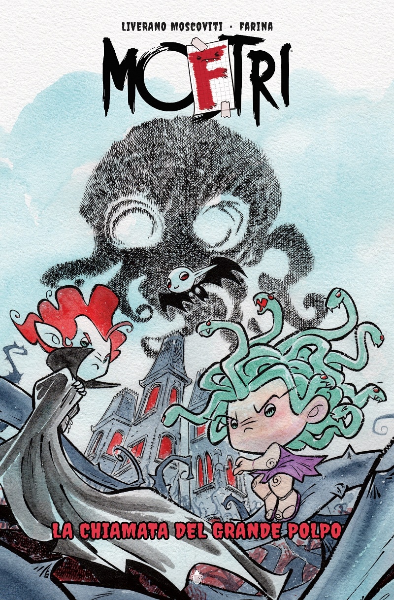 MoFtri è una striscia umoristica nata sull’antologico Mostri pubblicato dalla casa editrice romana Bugs Comics. Una produzione delicata e divertente che reinterpreta i più famosi mostri dell’immaginario horror in una versione dalla sensibilità unica che la rende una lettura adatta ad ogni tipo di età. Ora i simpatici personaggi escono dal formato “stretto” delle strisce e si guadagno un’avventura tutta per loro nel cartonato creato da Antonella Liverano Moscoviti e Adriana Farina che li vede collaborare in gruppo per fronteggiare La chiamata del Grande Polpo.