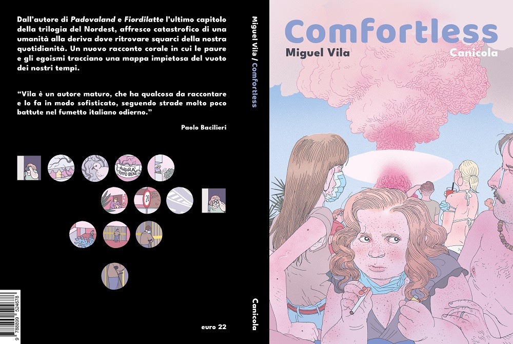 Dopo il successo di Padovaland e Fiordilatte arriva Comfortless, l’ultimo capitolo della trilogia del Nordest di Miguel Vila, affresco catastrofico di una umanità alla deriva dove ritrovare squarci della nostra quotidianità. Un nuovo racconto corale dove le paure e gli egoismi tracciano una mappa impietosa del vuoto dei nostri tempi.