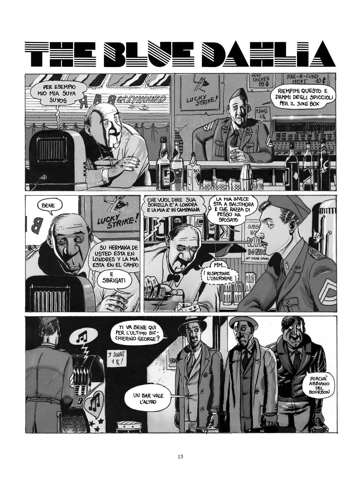 Insomma, Scòzzari è tornato a combattere con Raymond Chandler: anzi, per dirla con parole sue, a “ucciderlo a colpi di matita”. Ed è nata così La dalia blu (non più azzurra come apparve sulle pagine di Frigidaire): le sue nuove, scintillanti tavole compiono ancora una volta la magia di unire al fascino classico del noir di Chandler l’inconfondibile irriverenza e l’ironia caustica che sono il marchio di fabbrica di Scòzzari, “ragazzo terribile” del fumetto italiano.
