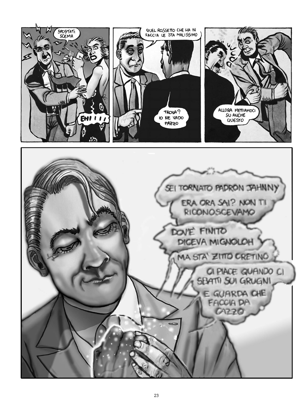 “Tra l’altro, in questa nuova edizione della Dalia, ho voluto mantenere i riassunti messi in testa alle puntate uscite su Frigo… Con quegli schizzetti di bile m’era piaciuto illustrare ai consumatori la sofferenza e l’antipatia nei confronti di Chandler che stavo resuscitando in vignette… ma soprattutto erano parte integrante dell’avventura/duello tra me e Chandler, della tortura autore contro autore…”. (Dall’introduzione di Filippo Scòzzari)