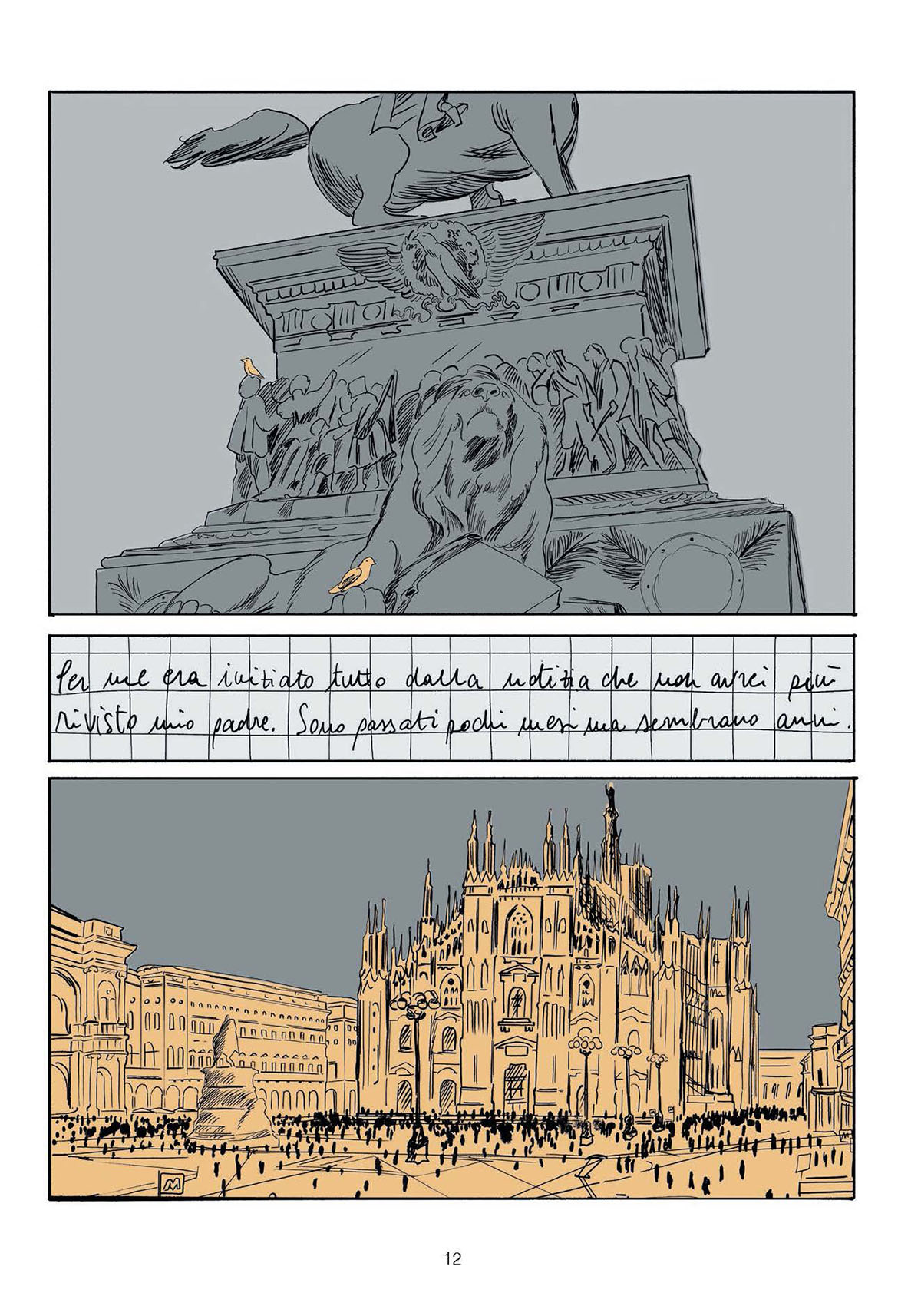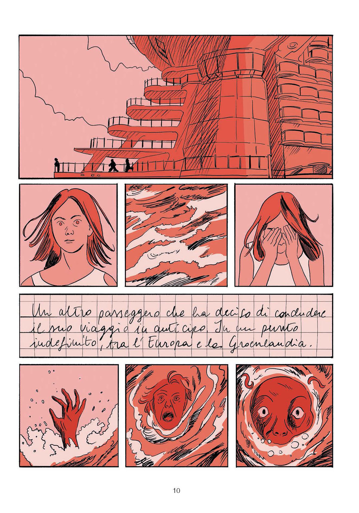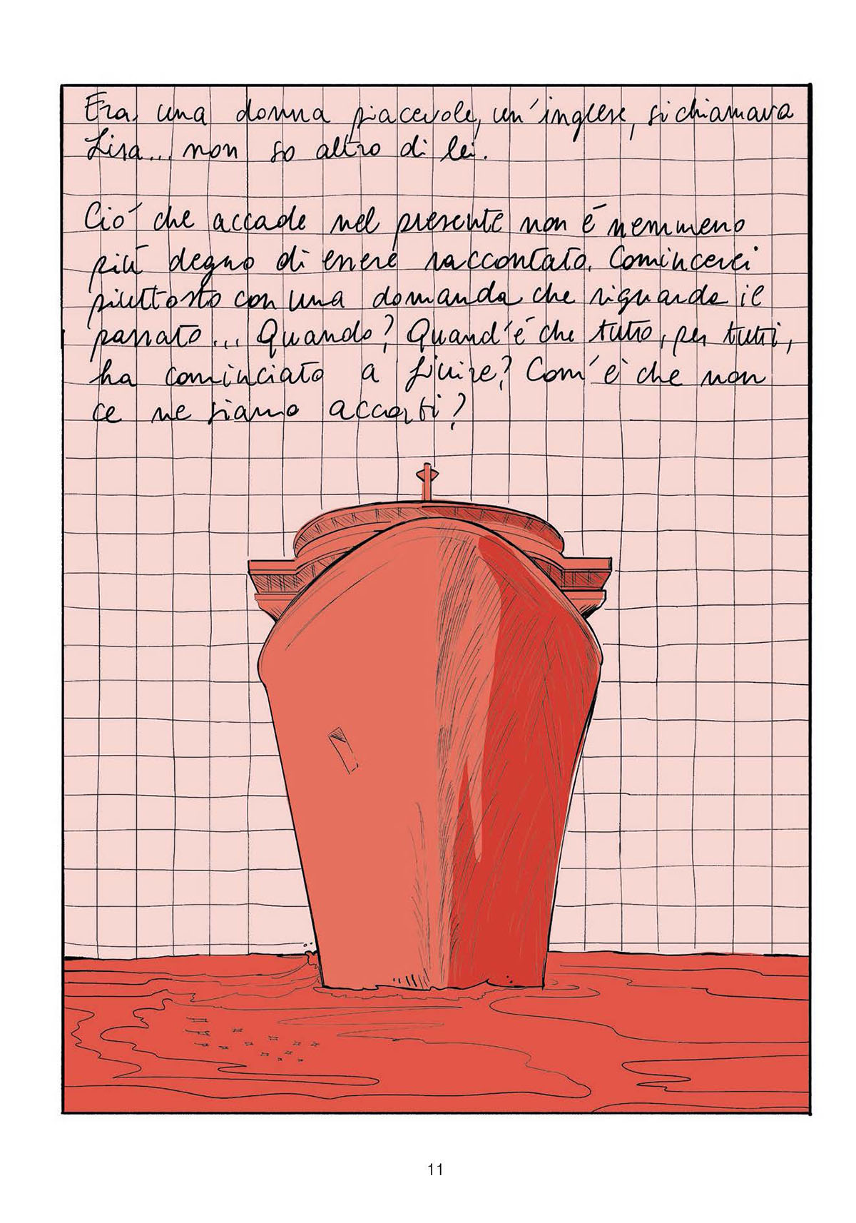 «La lettura di Fine mi ha accompagnato nell’immaginare scenari remoti, ma allo stesso tempo possibili. Sara inizia a raccontare la sua storia in una nave sospesa nel tempo. Questi primi istanti si traducono per me in uno spazio ai confini del mondo. Sembra che lei ci sia arrivata prima di noi, alle Colonne d’Ercole. Ed è qui che impariamo a riflettere: nel suo presente non si può più tornare indietro, si può solo andare avanti. Dove?È un viaggio a ritroso in cui le emozioni dei personaggi, che prima avevano un proprio posto, un ruolo definito, cambiano radicalmente perché cambia il mondo. Mi sono chiesta chi fosse il vero protagonista di tutta questa vicenda: è Sara? Siamo noi? O è il nostro pianeta, che mantiene il suo movimento, la sua rivoluzione, nonostante tutto? La realtà che Giuseppe Civati e Marco Tiberi evocano con la scrittura è forte e per me è sia un piacere che una sfida aggiungere una nuova voce a questo lavoro. Cerco di mettere in atto nel disegno un intervento di trasformazione per ricavare un nuovo livello di lettura: possiamo scorrere con i nostri occhi tra le frasi di Fine, e anche tra le tavole del fumetto, in modo simile a un sistema binario formato da due stelle che ruotano attorno a un baricentro comune».
