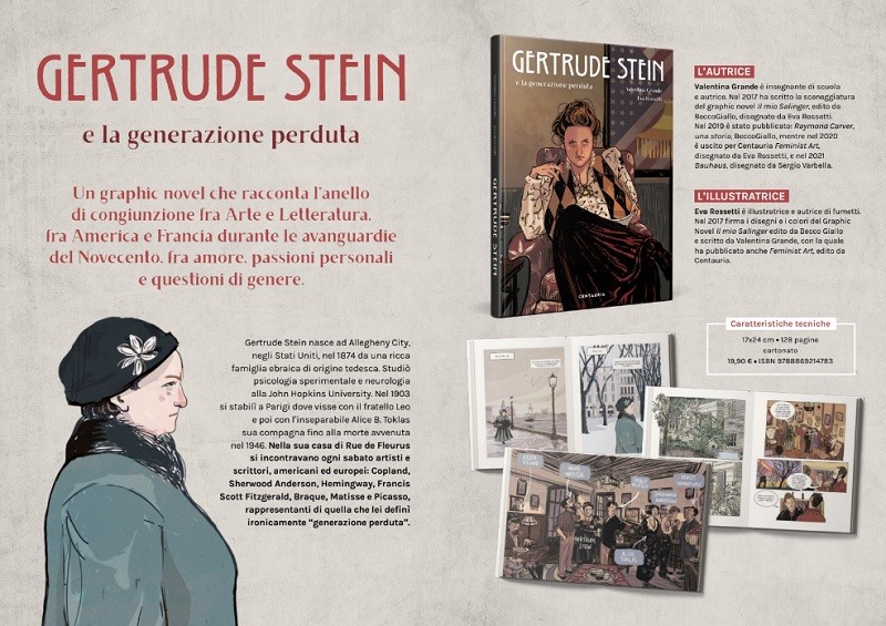 Centauria pubblica la sua nuova graphic novel per la collana dedicata alle più famose figure della storia dell’arte: Gertrude Stein e la generazione perduta. Gertrude Stein è stata una collezionista di opere d’arte, una musa, una scrittrice, una donna lesbica, ricca e arrogante. È stata anfitriona e mecenate di celebri artisti e intellettuali.