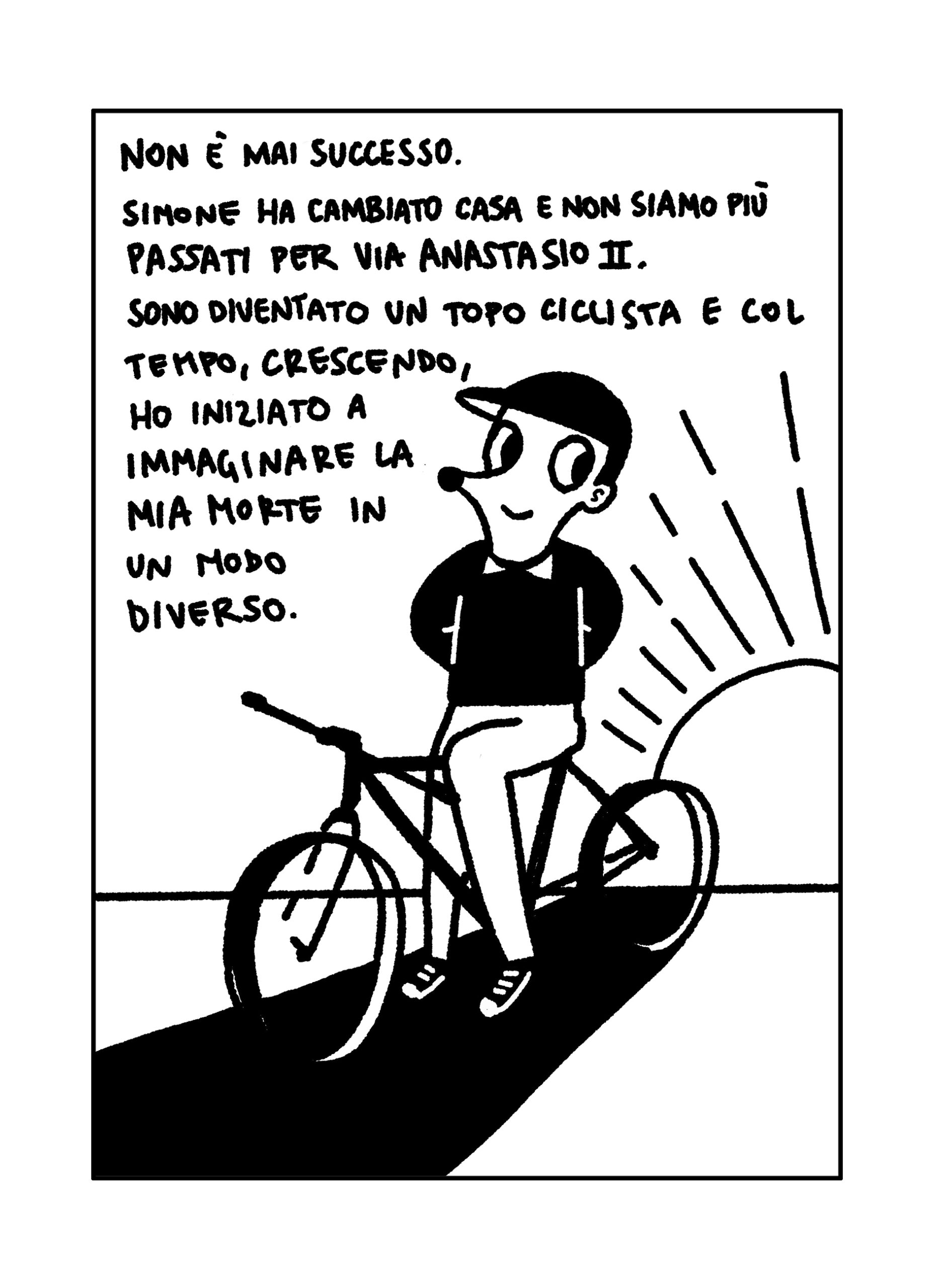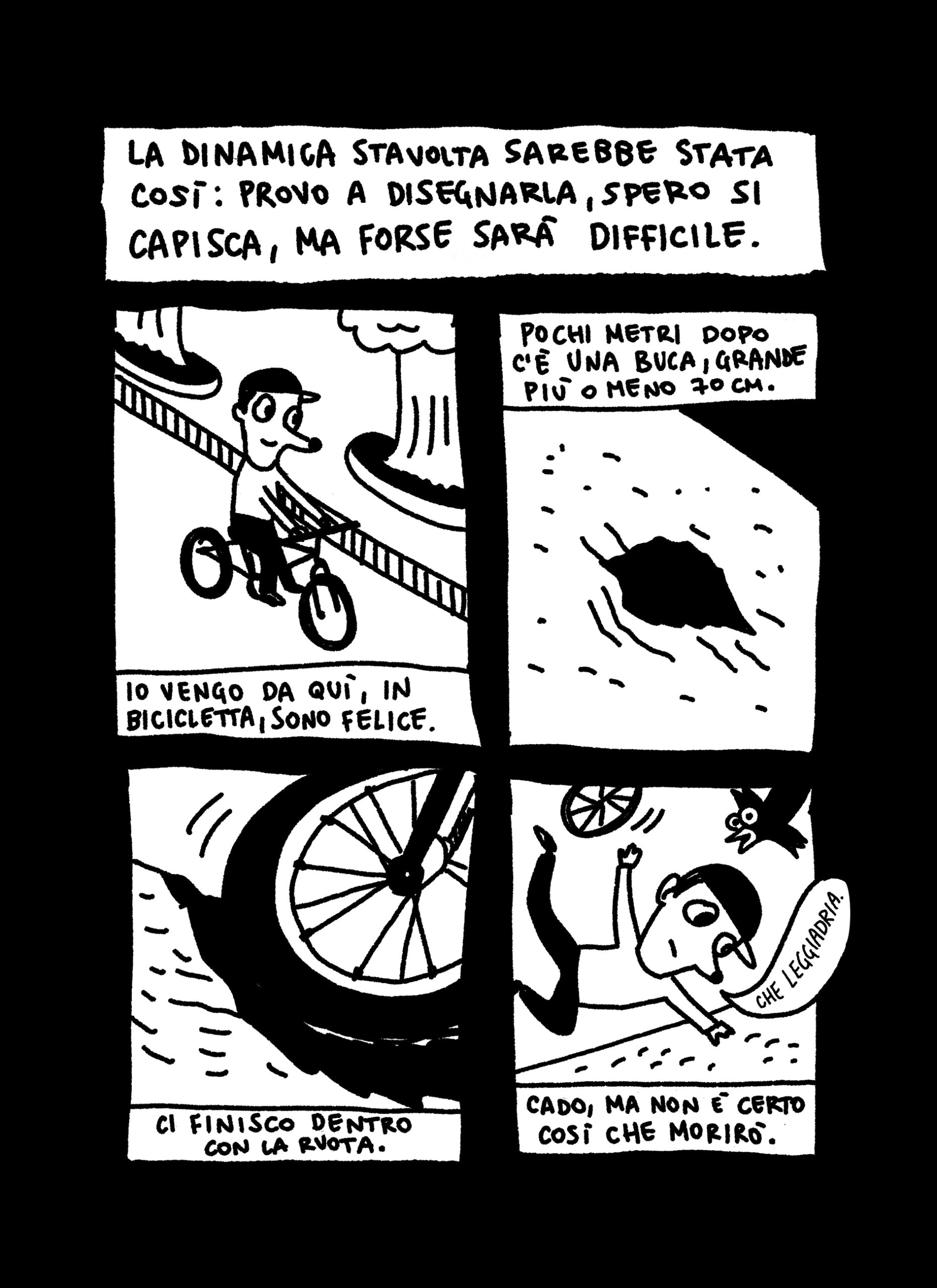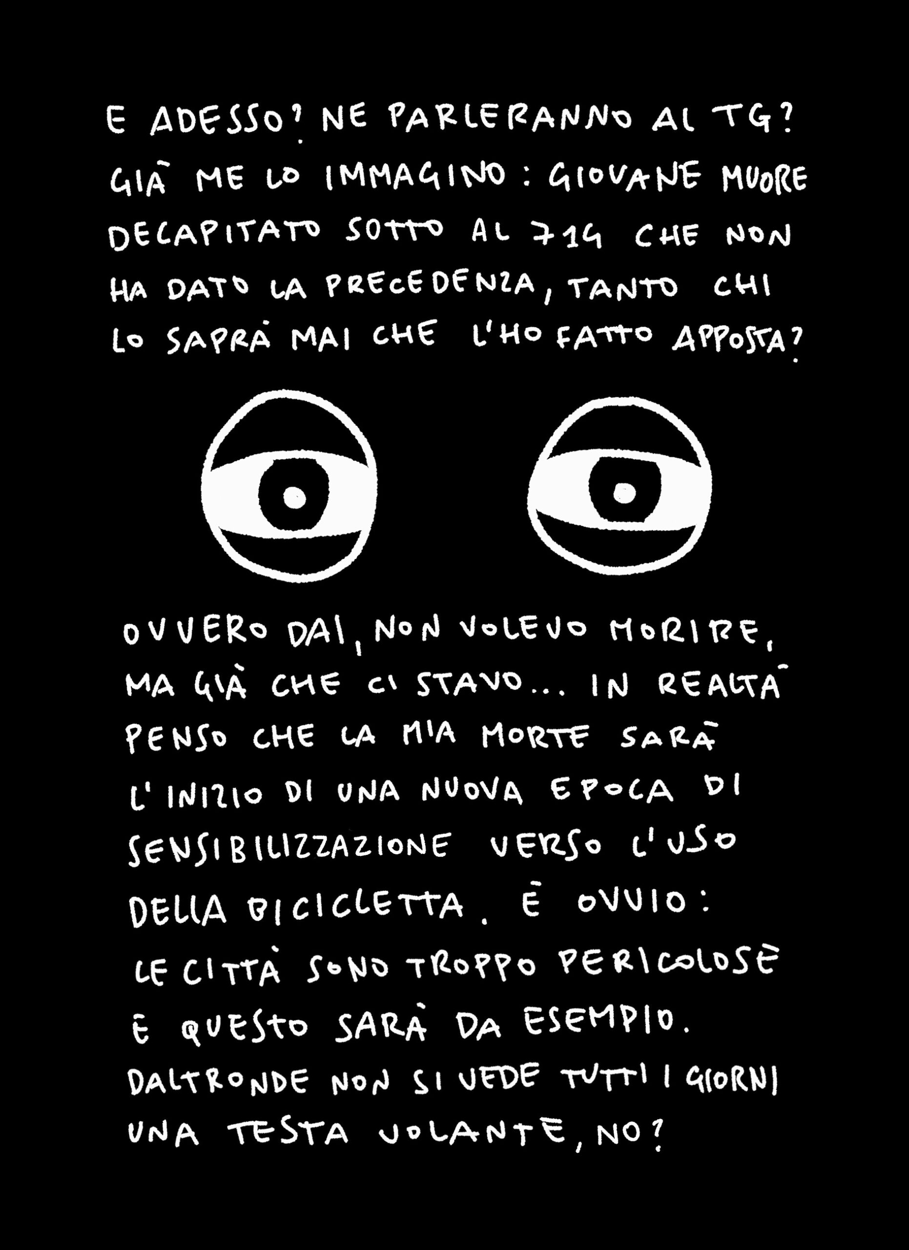 Si può morire, resuscitare, ci si può anche trasformare (sempre che la trasfigurazione sia riconosciuta) ma si può salvare il mondo? Si può essere ancora un eroe? O forse è solo meglio nascondere il proprio errore? Tra ironia, malinconia e stupore, Marco About costruisce un racconto surreale dove la vita e la morte si intrecciano in modi inaspettati, e il vero eroismo sta nell’andare avanti, pedalata dopo pedalata.
