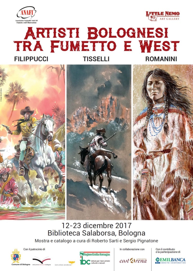 Dal 12 al 23 dicembre approda in Piazza coperta di Salaborsa il mondo del West alla bolognese. A rappresentarlo egregiamente, tre illustratori che hanno fatto la storia del fumetto: Lucio Filippucci, Giovanni Romanini e Sergio Tisselli. La mostra, organizzata dall’Associazione Nazionale Amici del Fumetto e dell’Illustrazione (Anafi) e da Little Nemo Art Gallery, visitabile negli orari di apertura di Salaborsa, raccoglie tante illustrazioni originali dove a farla da protagonista è uno sguardo allargato alle nostre colline e alle nostre pianure, che evoca scene e trame tipiche delle pianure del west americano.