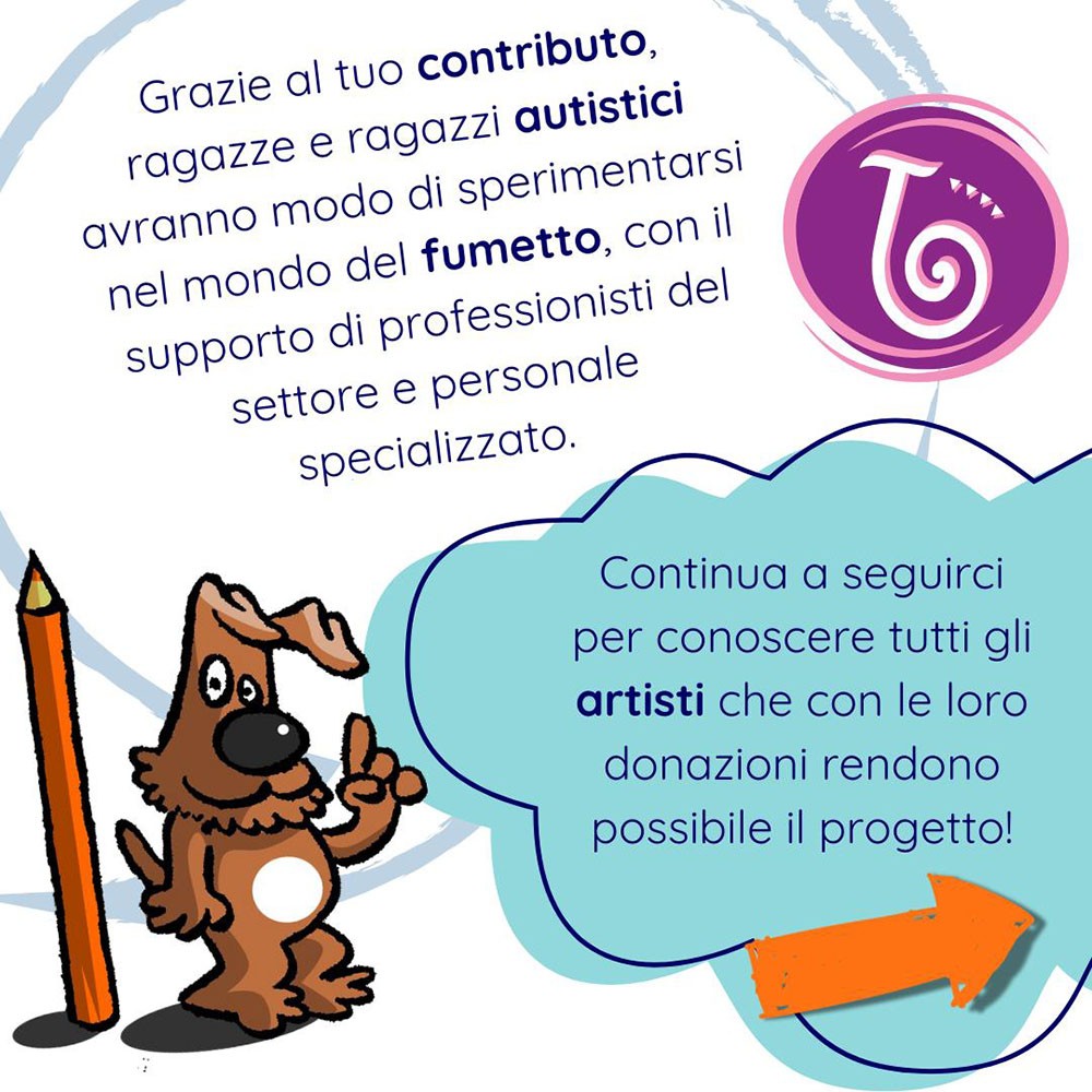 - le opere daranno il punto di vista di chi è affetto da autismo, in modo che lo possa esprimere al meglio al lettore normotipo: attraverso il linguaggio fumetto questi nuovi autori avranno l’obiettivo di realizzare un’ampia comunicazione che possa narrare l’autismo “dall’interno”, per raggiungere una formazione professionale fattiva; lavoreranno a stretto contatto con un editor esperto che possa garantire la qualità del prodotto editoriale, finalizzato ad una distribuzione capillare.Coloro che produrranno lavori professionali, con caratteristiche adeguate alla vendita libraria, potranno ricevere un compenso e continuare a raccontare le loro realtà e le difficoltà che incontrano.